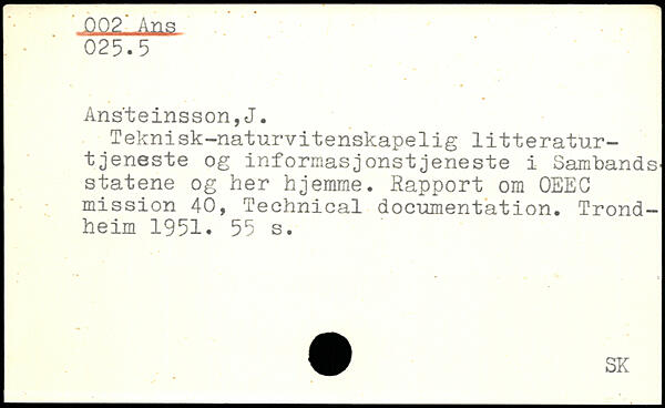 Ans'teinsson, J. Teknisk-naturvitenskapelig litteraturtjeneste og infonaasjonstjeneste i Sambands-statene og her hjemme. Rapport om OEEC mission 40, Technical documentation.