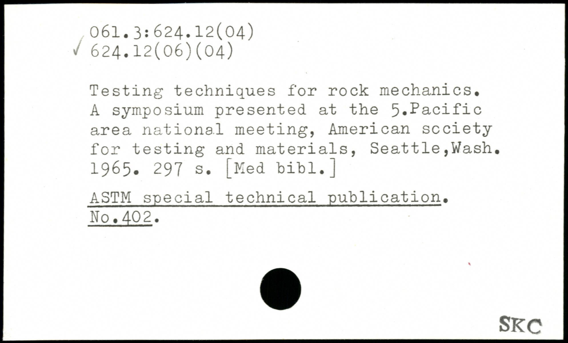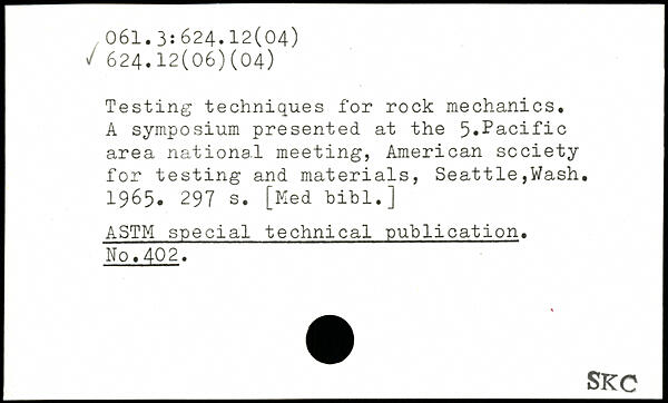 Testing techniques for rock mechanics, A symposium presented at the 5,Pacific area national meeting, American society for testing and materials, Seattle,Wash. 1965.