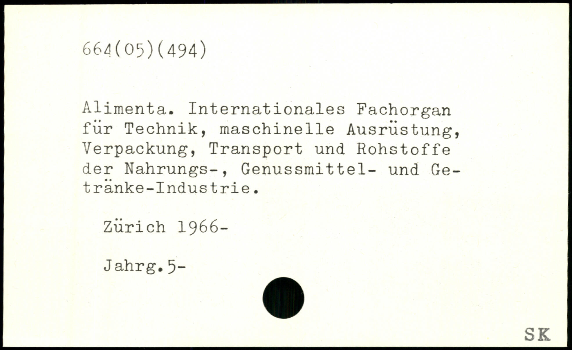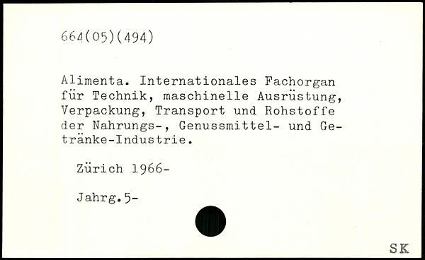 Alimenta. Internationales Fachorgan für Technik, maschinelle Ausrüstung, Verpackung, Transport und Rohstoffe der Nahrungs-, Genussmittel- und Ge-tränke-Industrie. Zürich 1966- Jahrg.5-