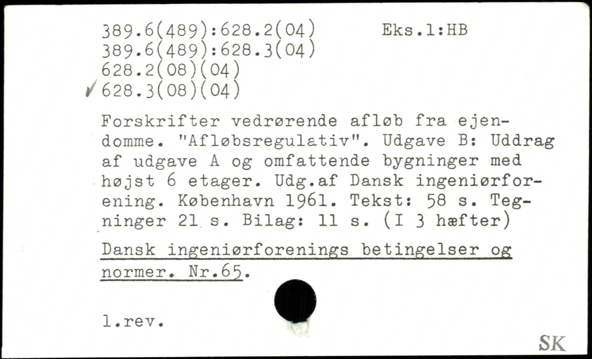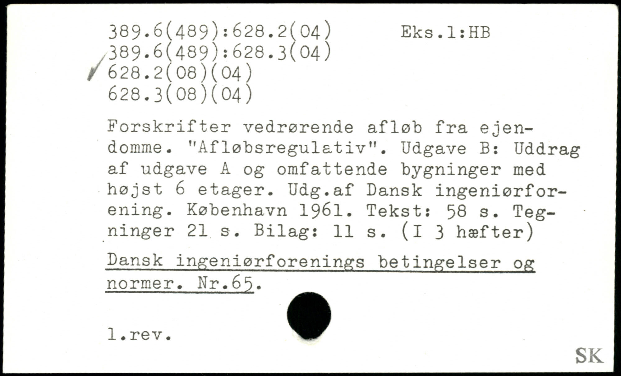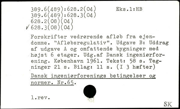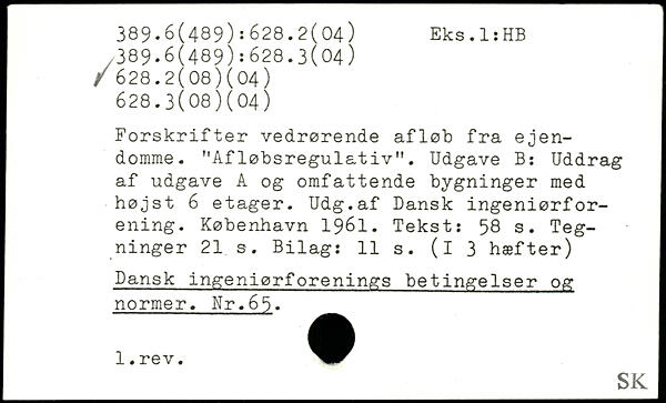Forskrifter vedrørende afløb fra ejendomme. "Afløbsregulativ". Udgave B: Uddrag af udgave A og omfattende bygninger med højst 6 etager. Udg.af Dansk ingeniørforening.