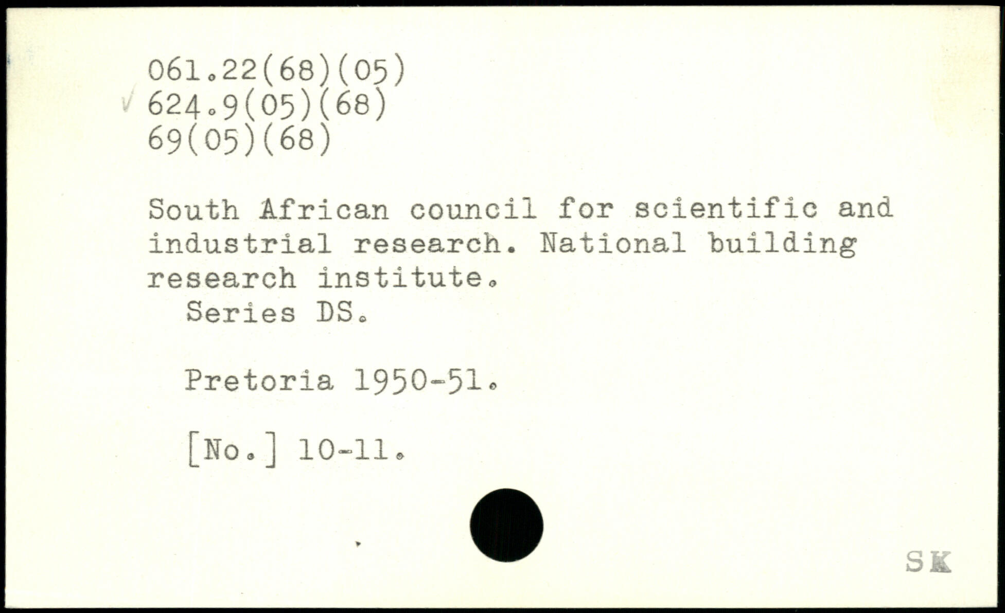 South African council for scientific and industrial research. National building research institute. Series DS. Pretoria 1950-51, [No.] 10-11.