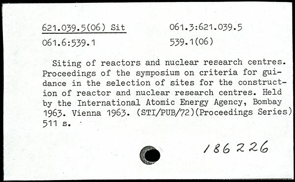 Siting of reactors and nuclear research centres. Proceedings of the symposium on criteria for guidance in the selection of sites for the construction of reactor and nuclear research centres. Held by the International Atomic Energy Agency, Bombay 1963. Vienna 1963. (STl/PUB/72)(Proceedings Series)