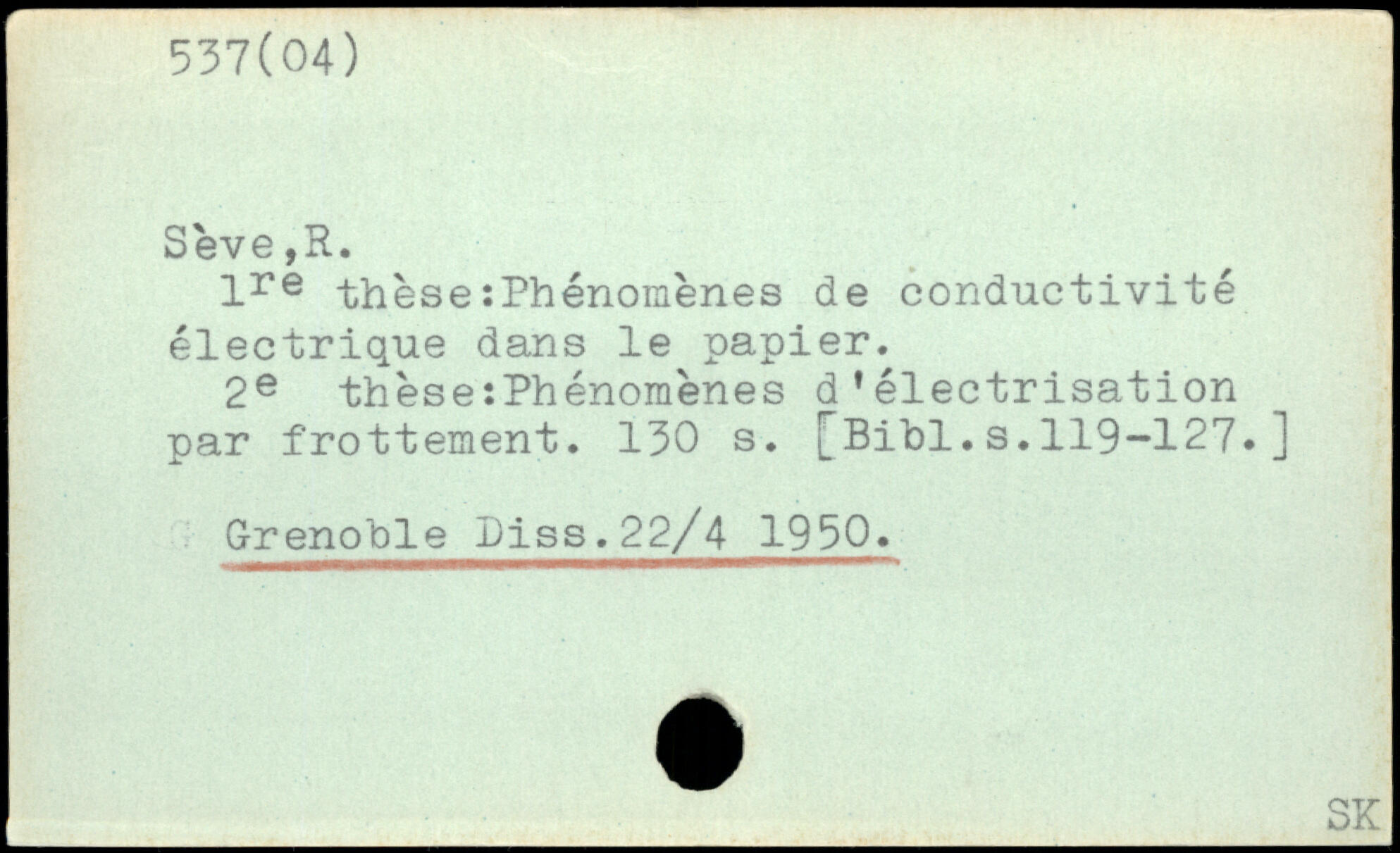 Sève,R. lre thèse:Phénomènes de conductivité électrique dans le papier. 2e thèse:Phénomènes d'électrisation par frottement.