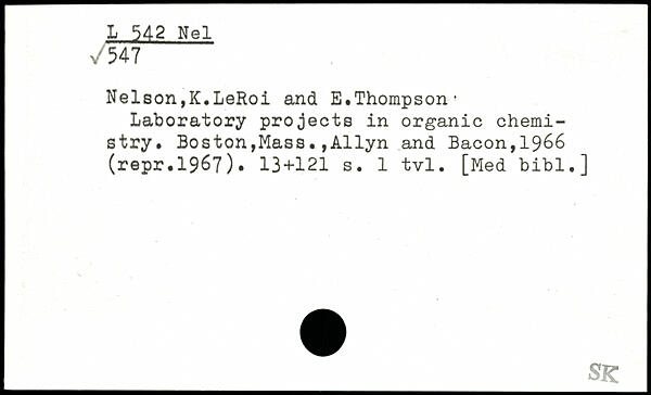 Nelson,K.LeRoi and E.Thompson. Laboratory projects in organic chemistry. Boston,Mass.,Allyn .and Bacon,1966 (repr.1967).