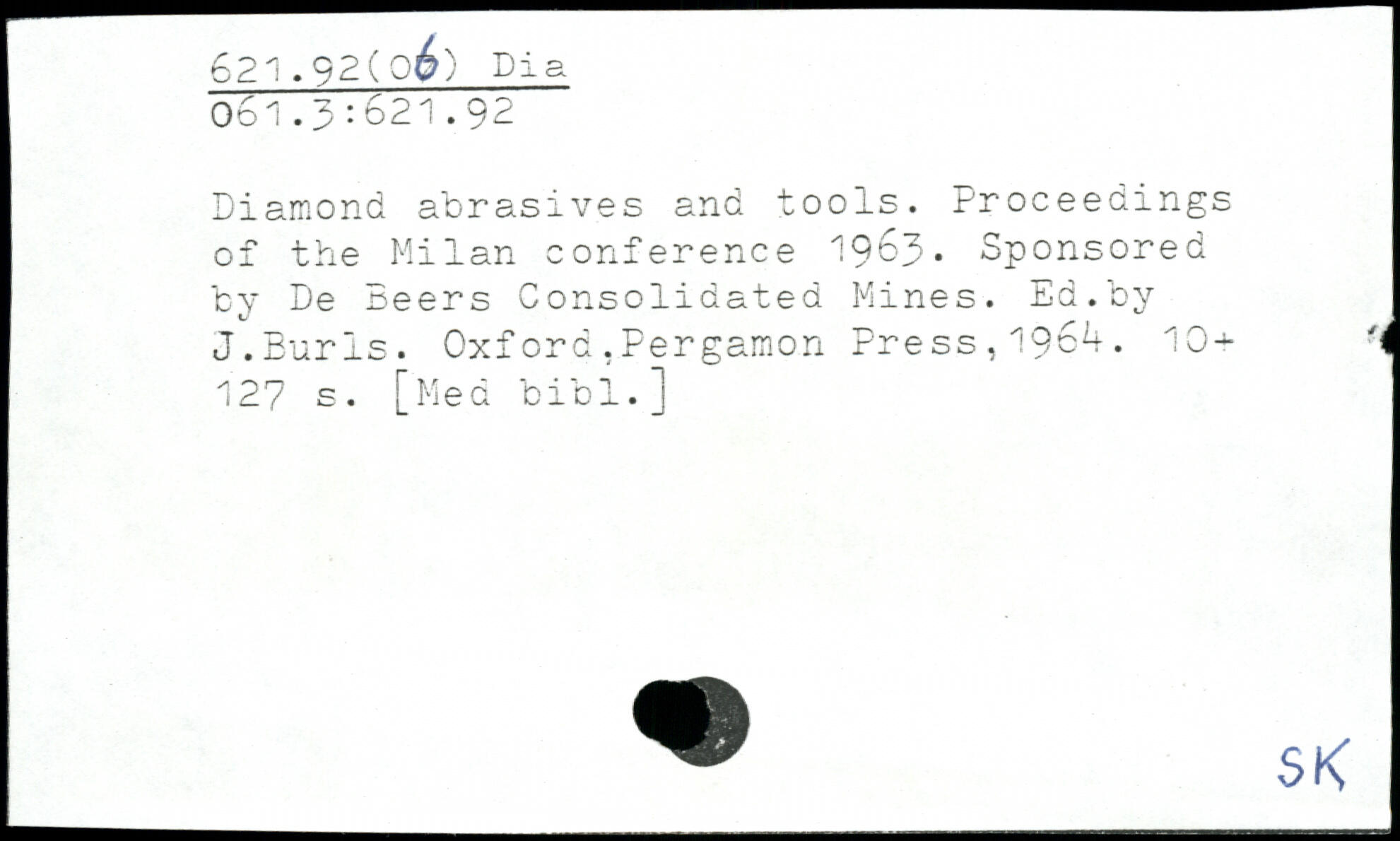 Diamond abrasives and tools, proceedings of the Milan conference 1963. Sponsored by De Beers Consolidated Mines. Ed.by J.Burls. Oxford.Pergamon Press,1969. 10- '<