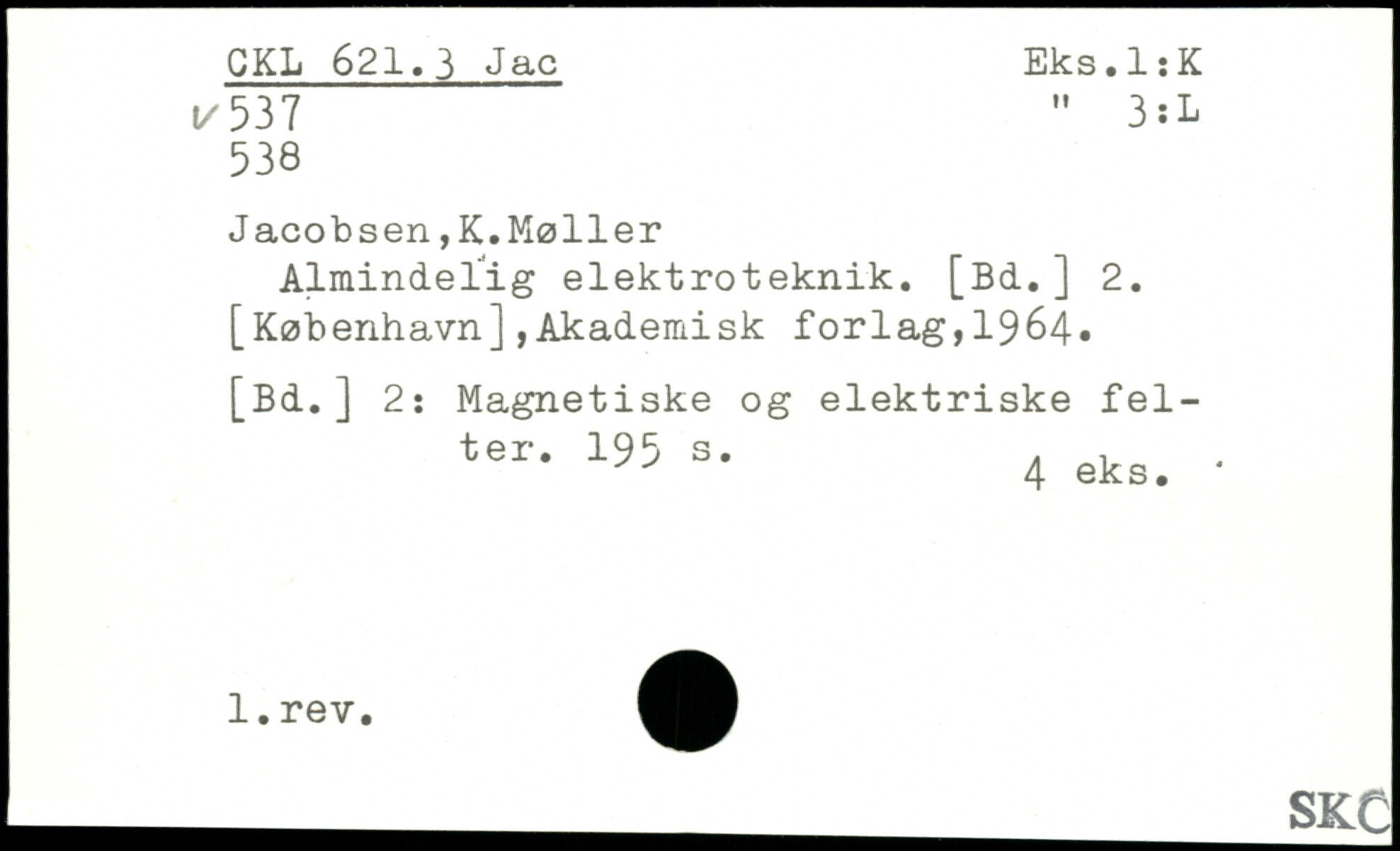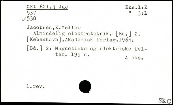 Jacobsen,K.Møller Almindelig elektroteknik. [Bd.] 2. [København],Akademisk forlag,1964, [Bd.] 2: Magnetiske og elektriske felter.