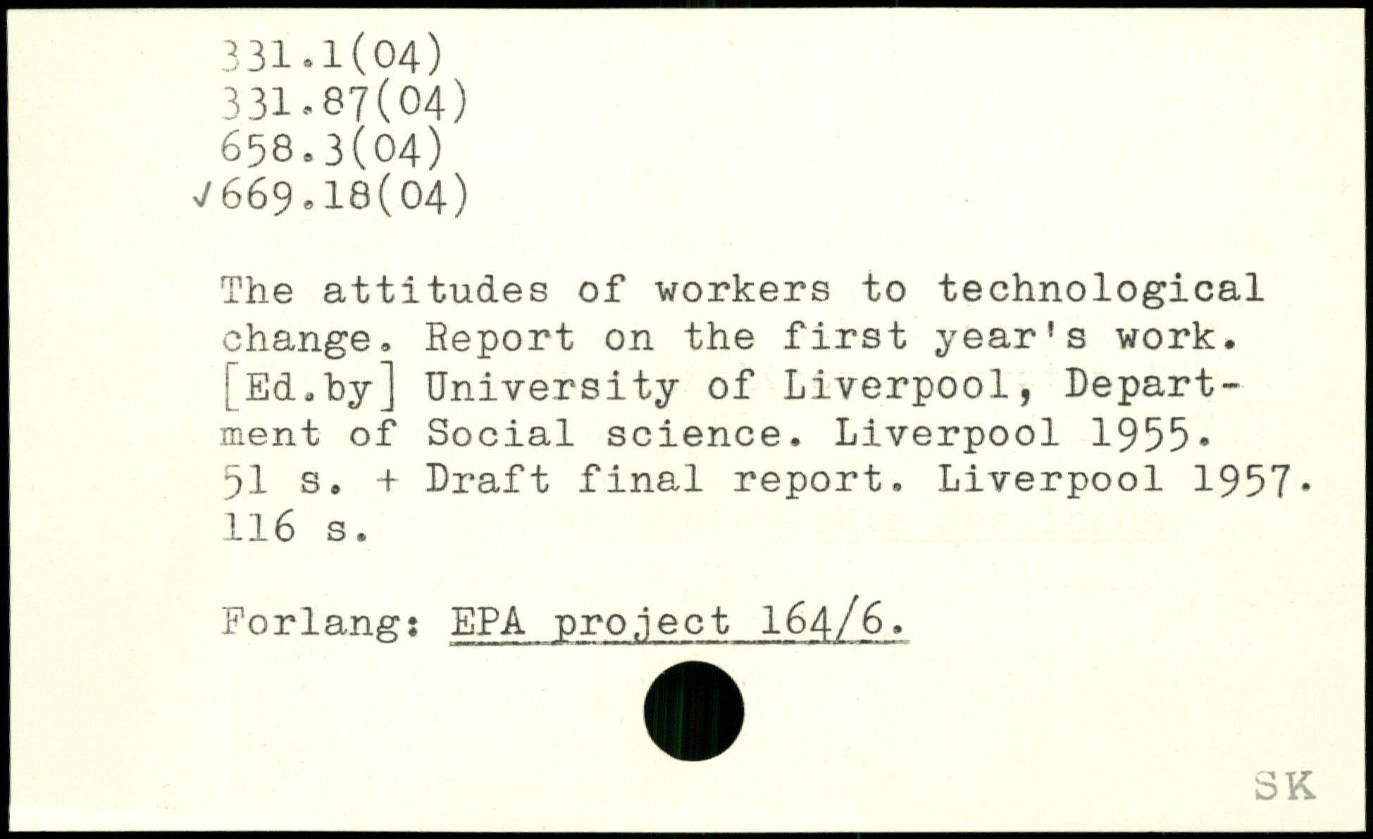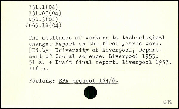 The attitudes of workers to technological change. Report on the first year's work. [Ed.by] University of Liverpool, Department of Social science.