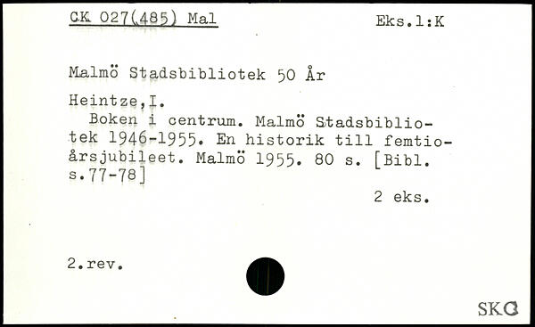 Malmö Stadsbibliotek 50 År Heintze,1. Boken i centrum. Malmö Stadsbibliotek 1946-1955, En historik till femtioårsjubileet. Malmö 1955.