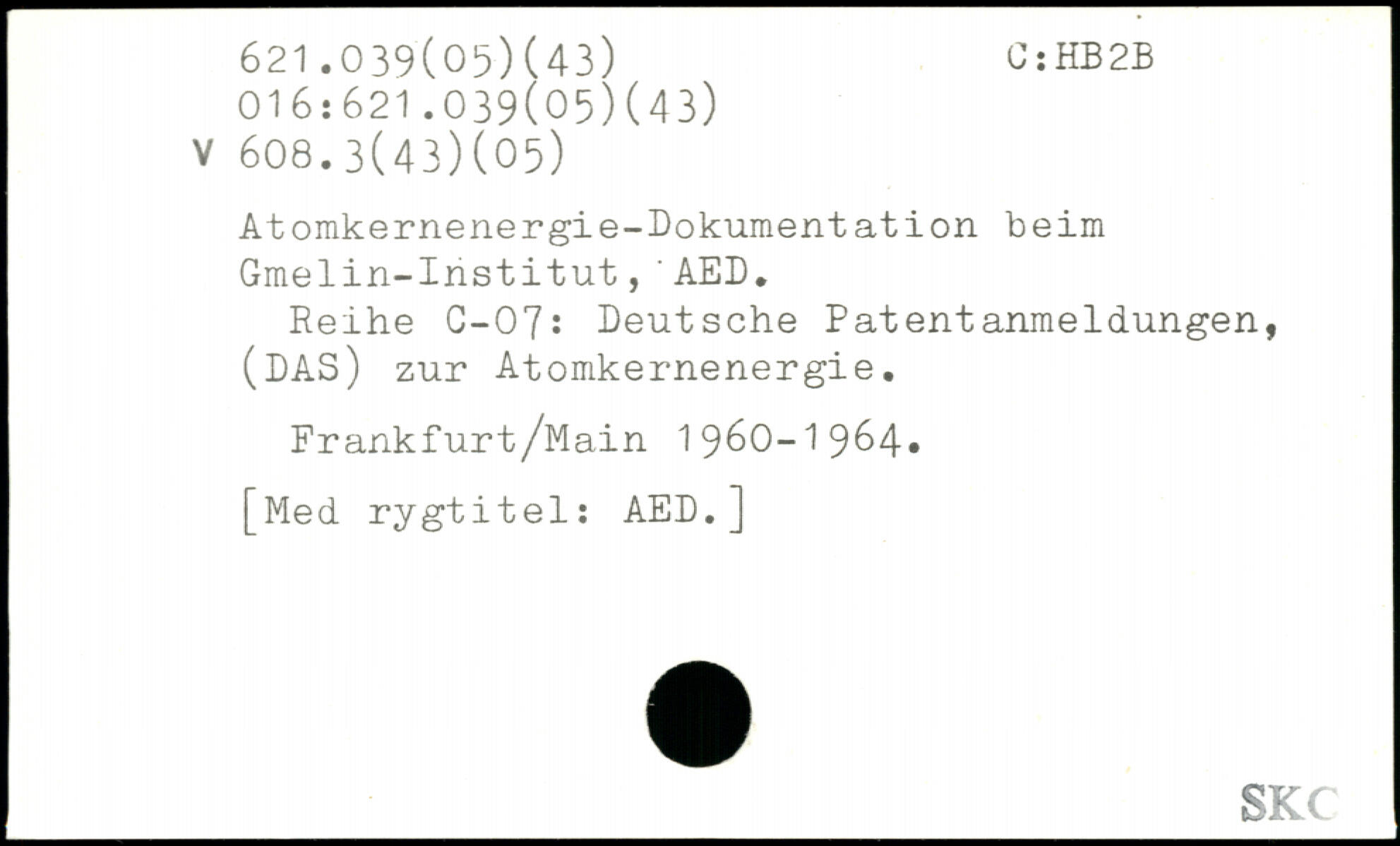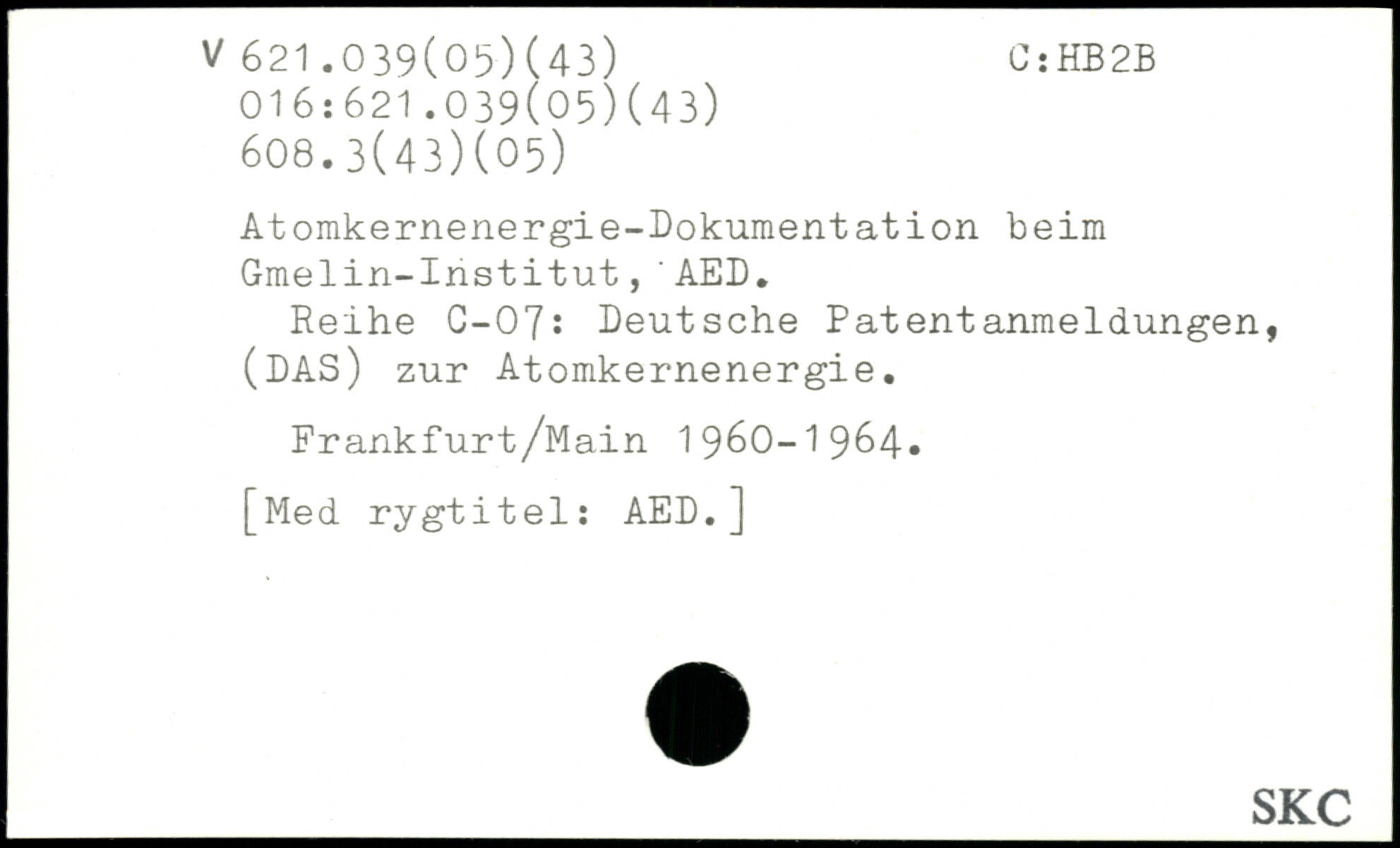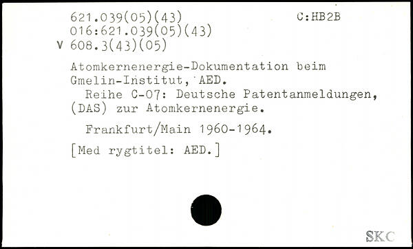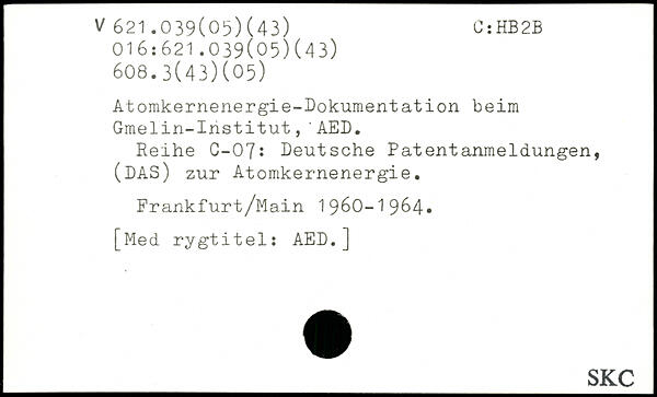 Atomkernenergie-Dokumentation beim Gmelin-Institut,'AED. Reihe C-07: Deutsche Patentanmeldungen, (DAS) zur Atomkernenergie. Frankfurt/Main 1960-1964,