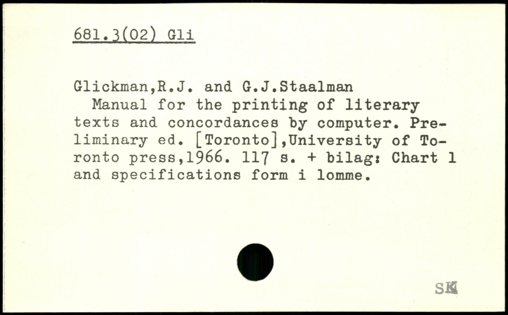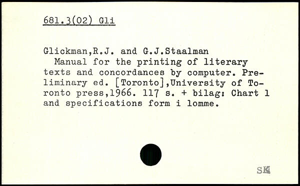 Manual for the printing of literary texts and concordances by computer. Preliminary ed. [Toronto],University of Toronto press,1966.