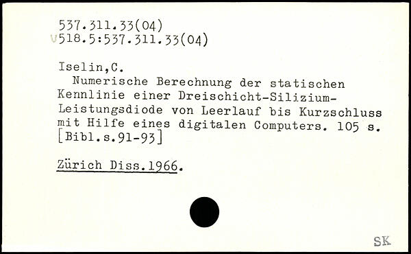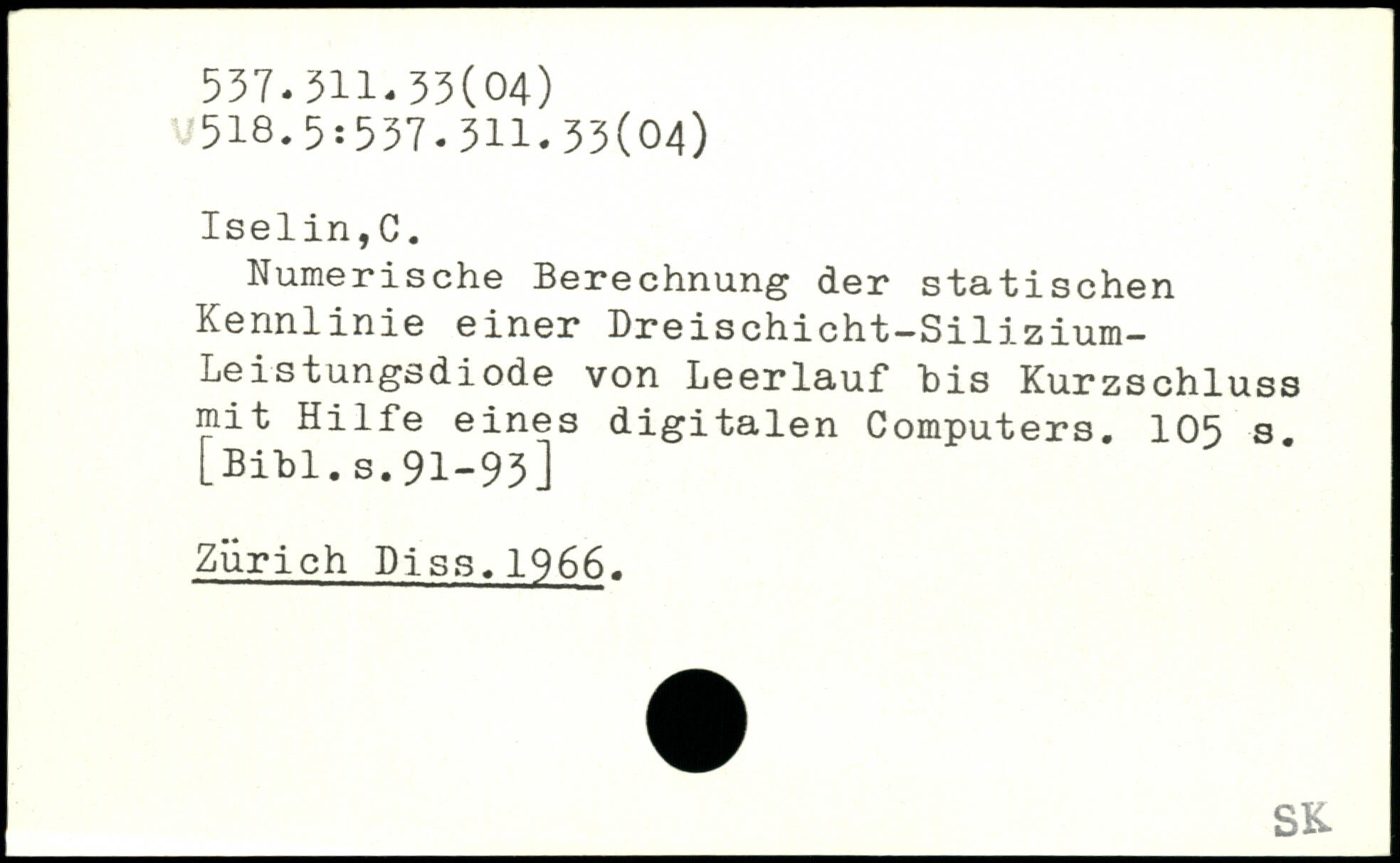 Numerische Berechnung der statischen Kennlinie einer Dreischicht-Silizium-Leistungsdiode von Leerlauf bis Kurzschluss mit Hilfe eines digitalen Computers.