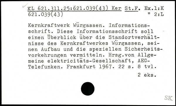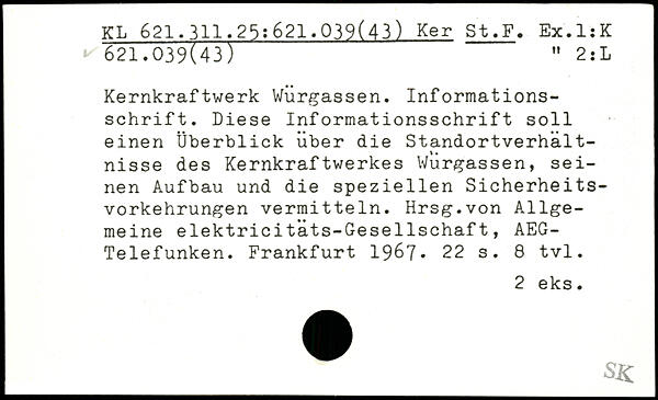 Kernkraftwerk Wurgassen. Informationsschrift. Diese Informationsschrift soll einen Überblick über die Standortverhältnisse des Kernkraftwerkes Wurgassen, seinen Aufbau und die speziellen Sicherheitsvorkehrungen vermitteln. Hrsg.von Allgemeine elektricitäts-Gesellschaft, AEG-Telefunken. Frankfurt 1967.