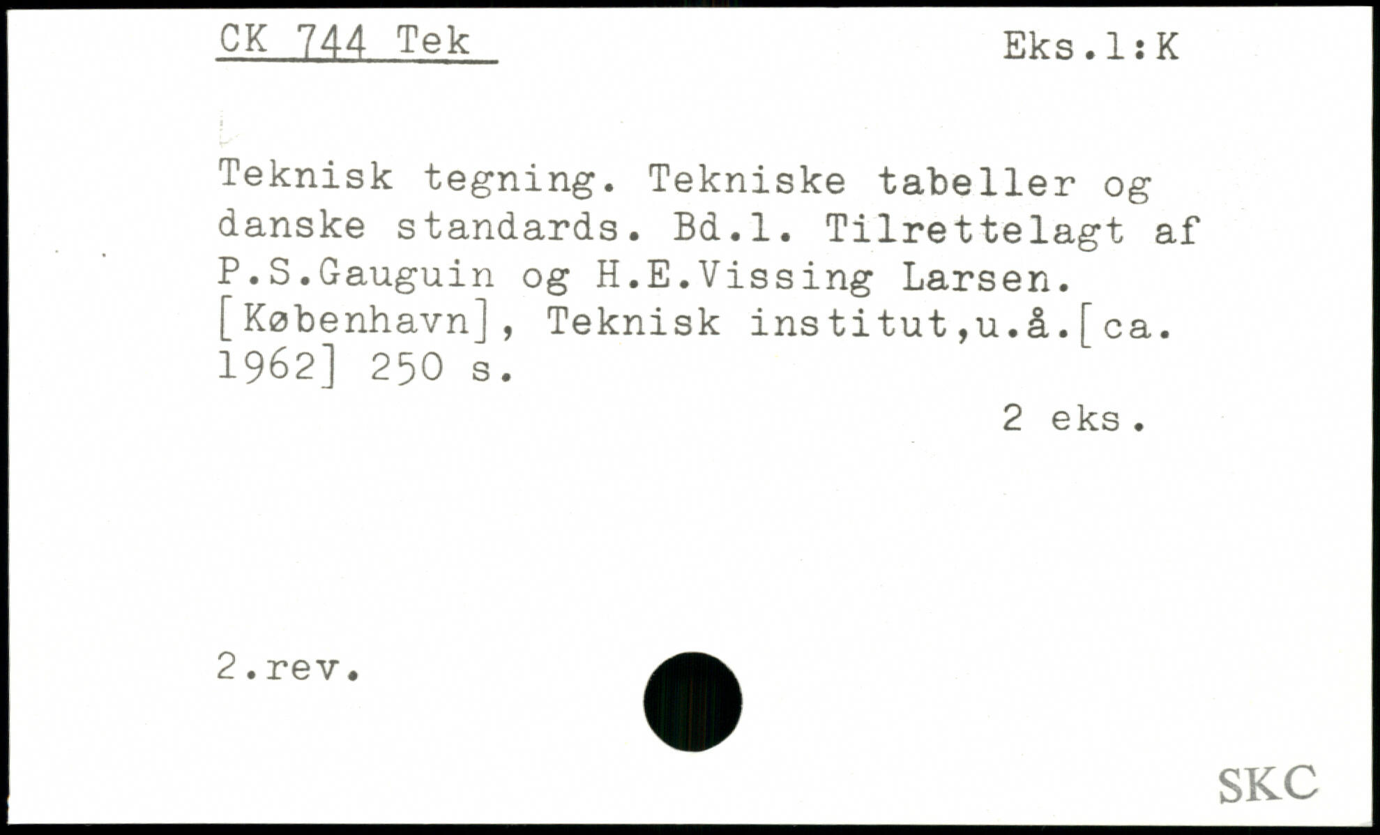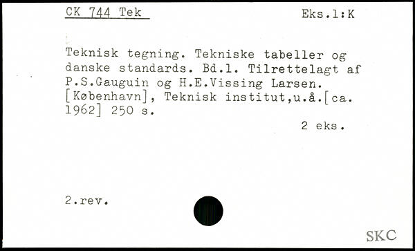 Teknisk tegning. Tekniske tabeller og danske standards. Bd.l. Tilrettelagt af P.S.Gauguin og H.E.Vissing Larsen. [København], Teknisk institut,u.å.[ca. 1962]