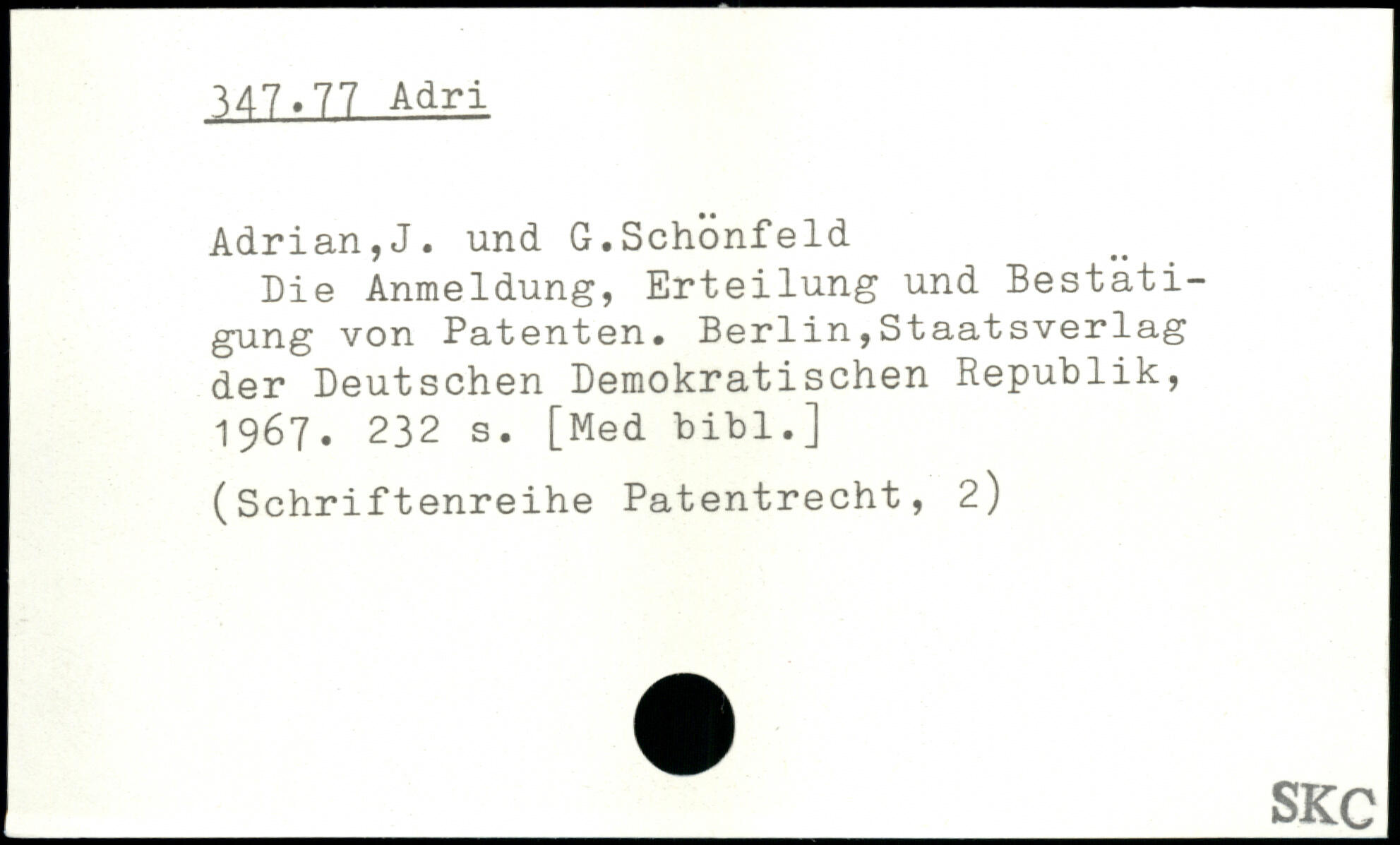 Die Anmeldung, Erteilung und Bestätigung von Patenten. Berlin,Staatsverlag der Deutschen Demokratischen Republik, 1967.