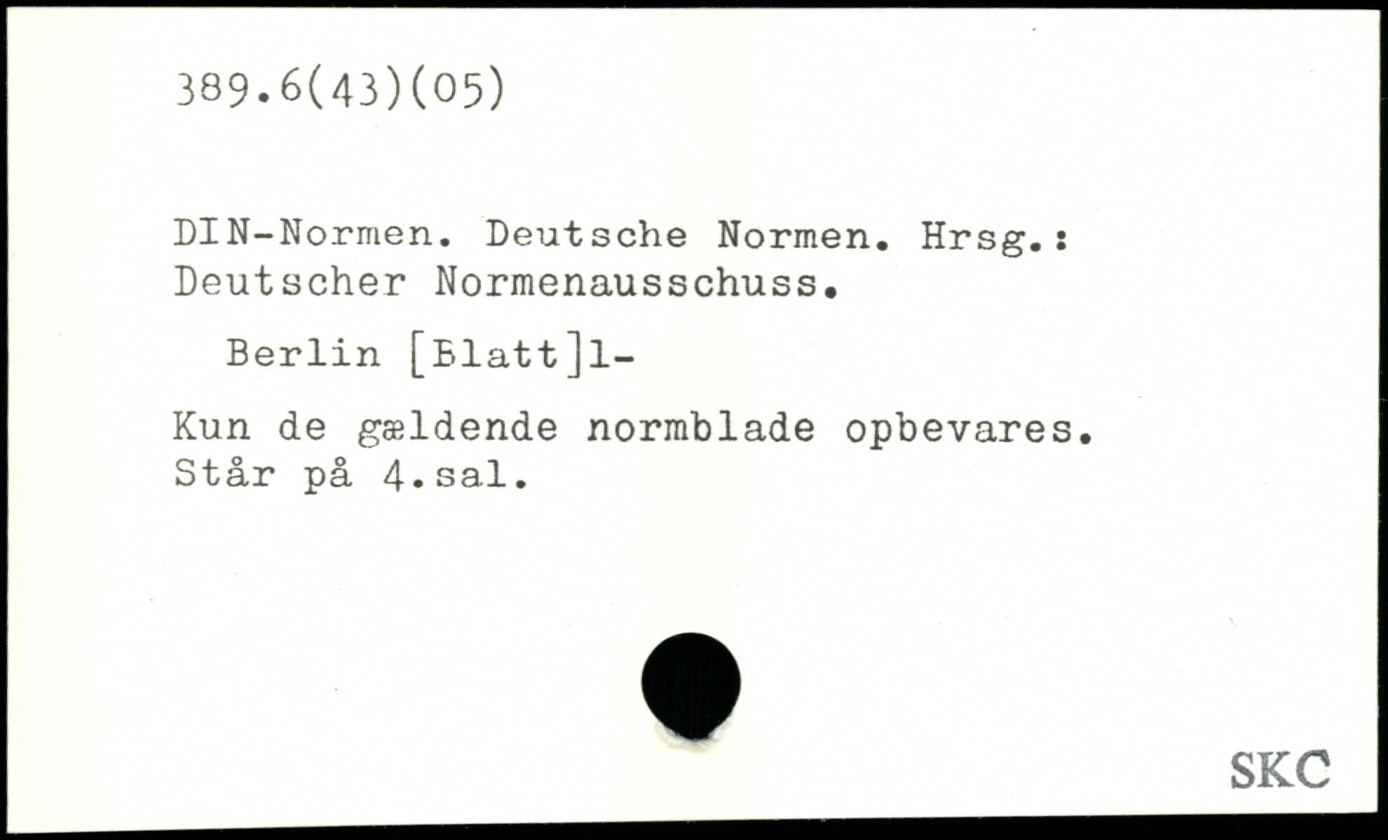 DIN-Normen. Deutsche Normen. Hrsg.: Deutscher Normenausschuss, Berlin [Blatt]l- Kun de gældende normblade opbevares. Står på 4,sal.