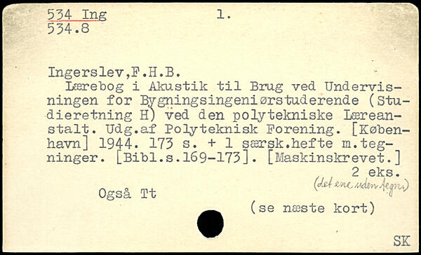 Lærebog i Akustik til Brug ved Undervisningen for Eygningsingeniørstuderende (Studieretning H) ved den polytekniske Læreanstalt. Udg.af Polyteknisk Forening. [København] 194-4.