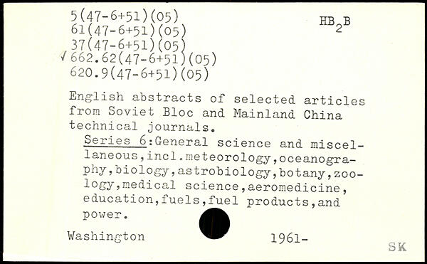 English abstracts of. selected, articles from Soviet Bloc and Mainland China technical journals. Series 6;General science and miscellaneous ,incl.meteorology,oceanography ,biology,astrobiology,botany,zoo-logy,medical science,aeromedicine, education,fuels,fuel products,and power.