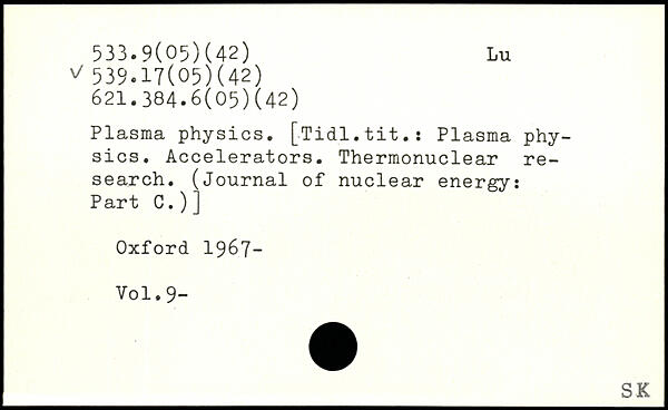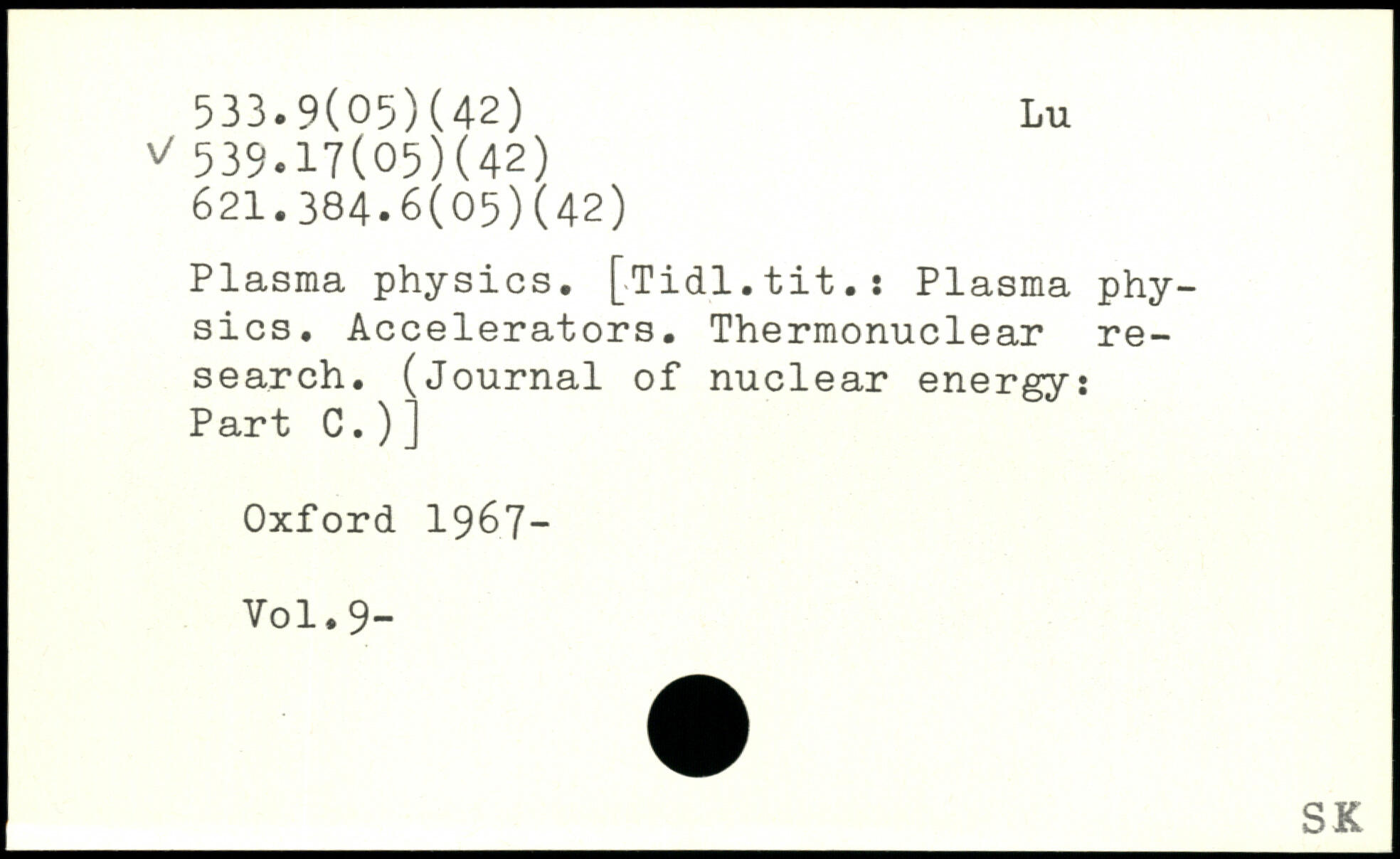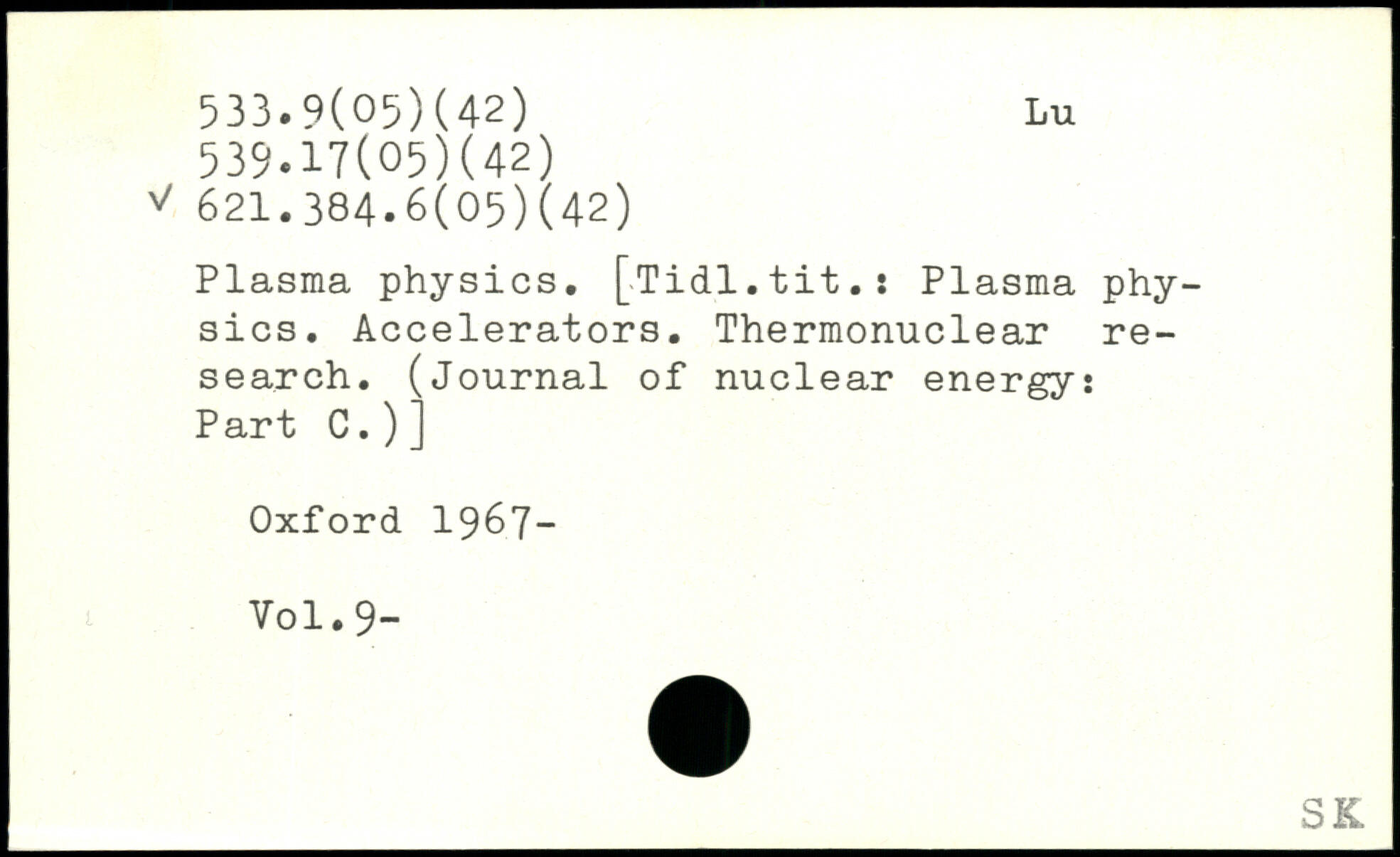 Plasma physios. [Tidl.tit.i Plasma phy-sics. Accelerators. Thermonuclear research. (Journal of nuclear energy: Part C.)]