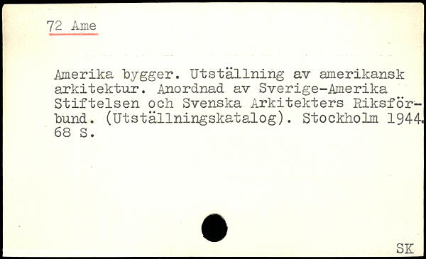Amerika bygger. Utställning av amerikansk arkitektur. Anordnad av Sverige-Amerika Stiftelsen och Svenska Arkitekters Riksförbund. (Utställningskatalog).