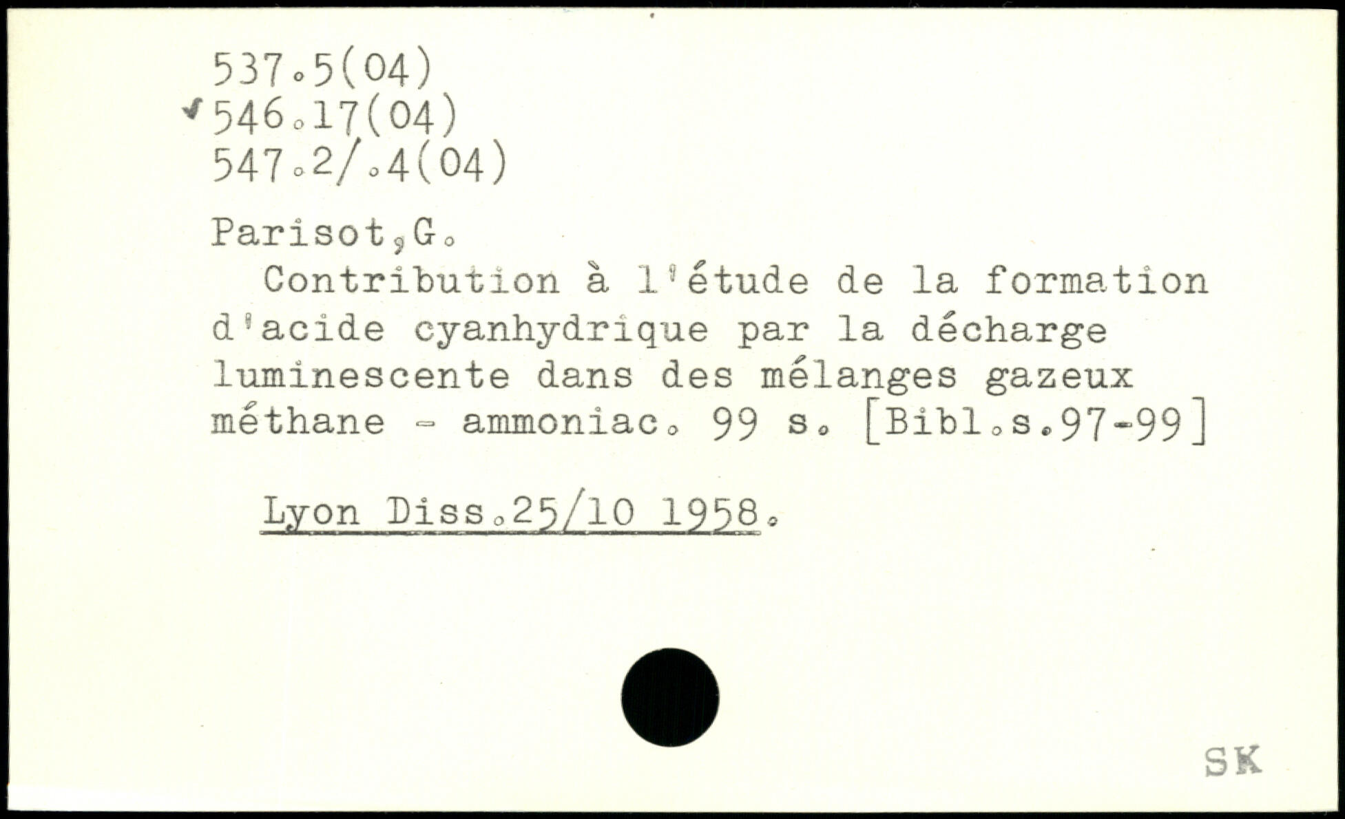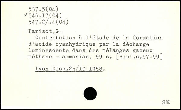 Parisot s Go Contribution à l’étude de la formation d’acide cyanhydrique par la décharge luminescente dans des mélanges gazeux méthane = ammoniac <>