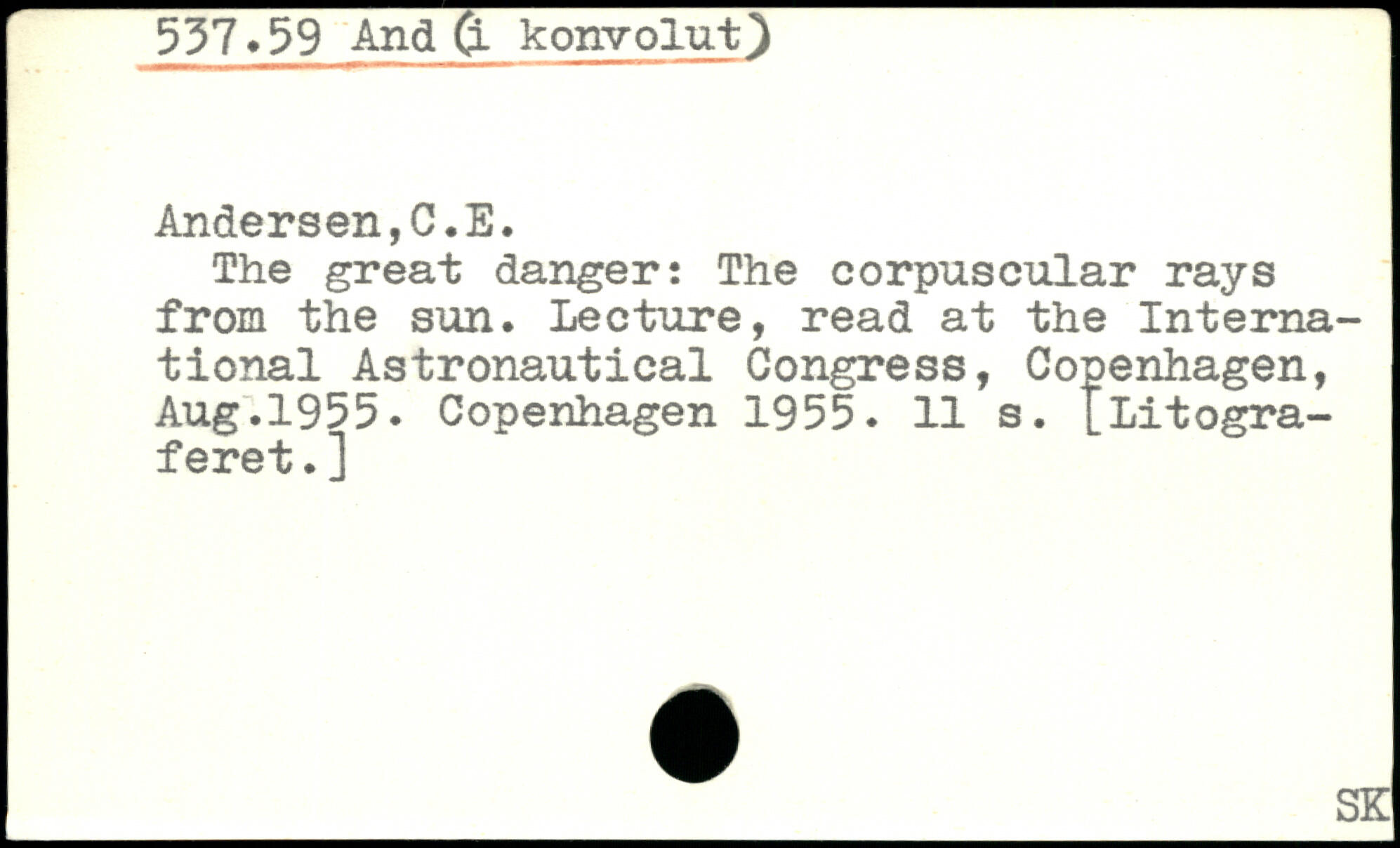 The great danger: The corpuscular rays from the sun. Lecture, read at the International Astronautical Congress, Copenhagen, Aug.1955.