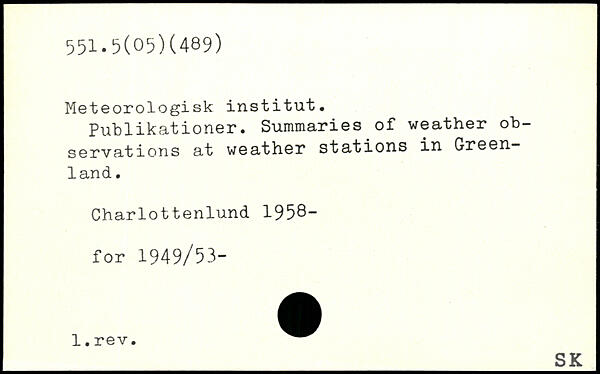 Meteorologisk institut. Publikationer. Summaries of weather observations at weather stations in Greenland. Chariottenlund 1958- for 1949/53-