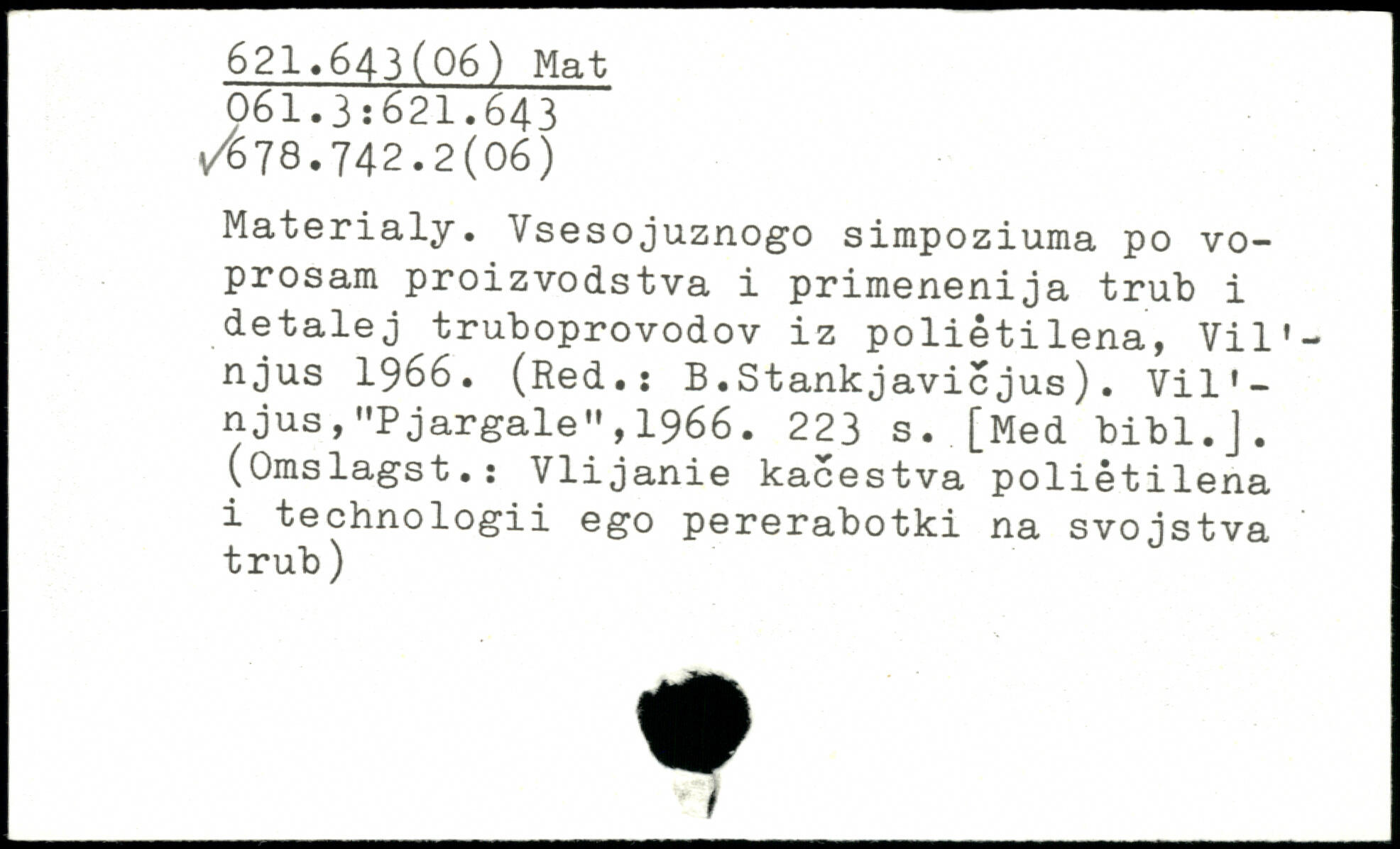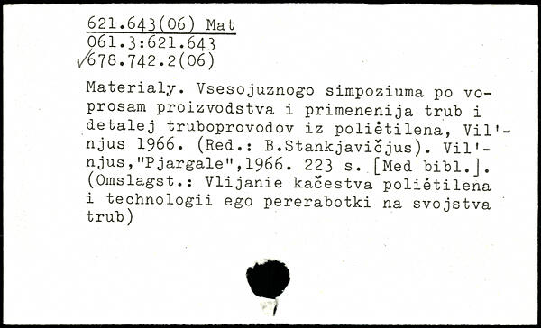 Materialy. Vsesojuznogo simpoziuma po vo-prosam proizvodstva i primenenija trub i detalej truboprovodov iz poliétilena, Vil.-njus 1966. (Red.: B.Stankjavicjus). Vil'-njus,MPjargale",1966.