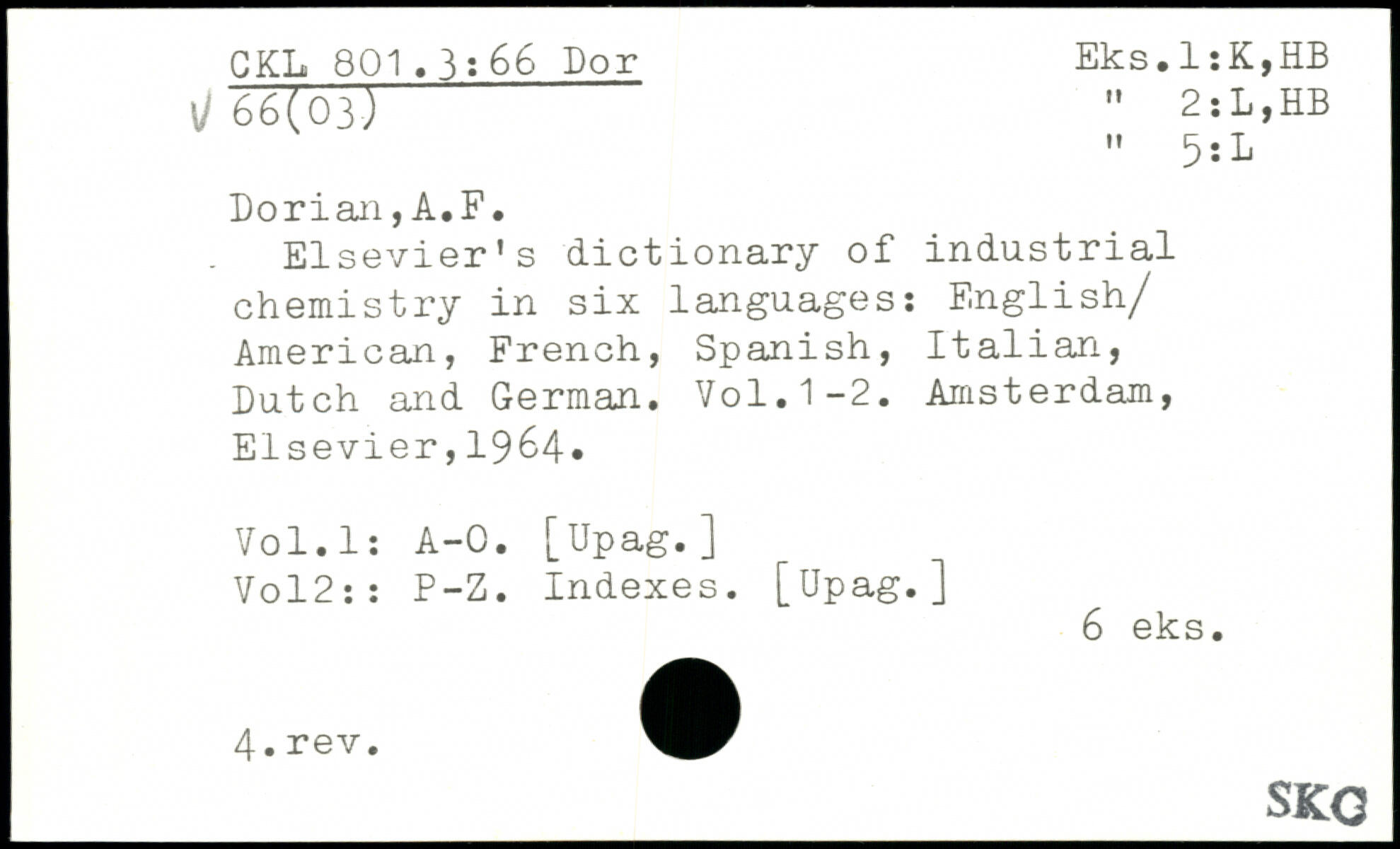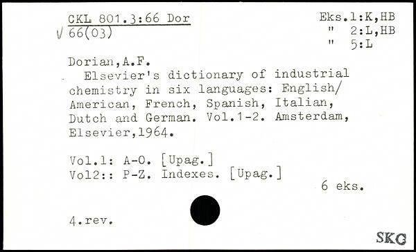 Elsevier's dictionary of industrial chemistry in six languages: English/ American, French, Spanish, Italian, Dutch and German.