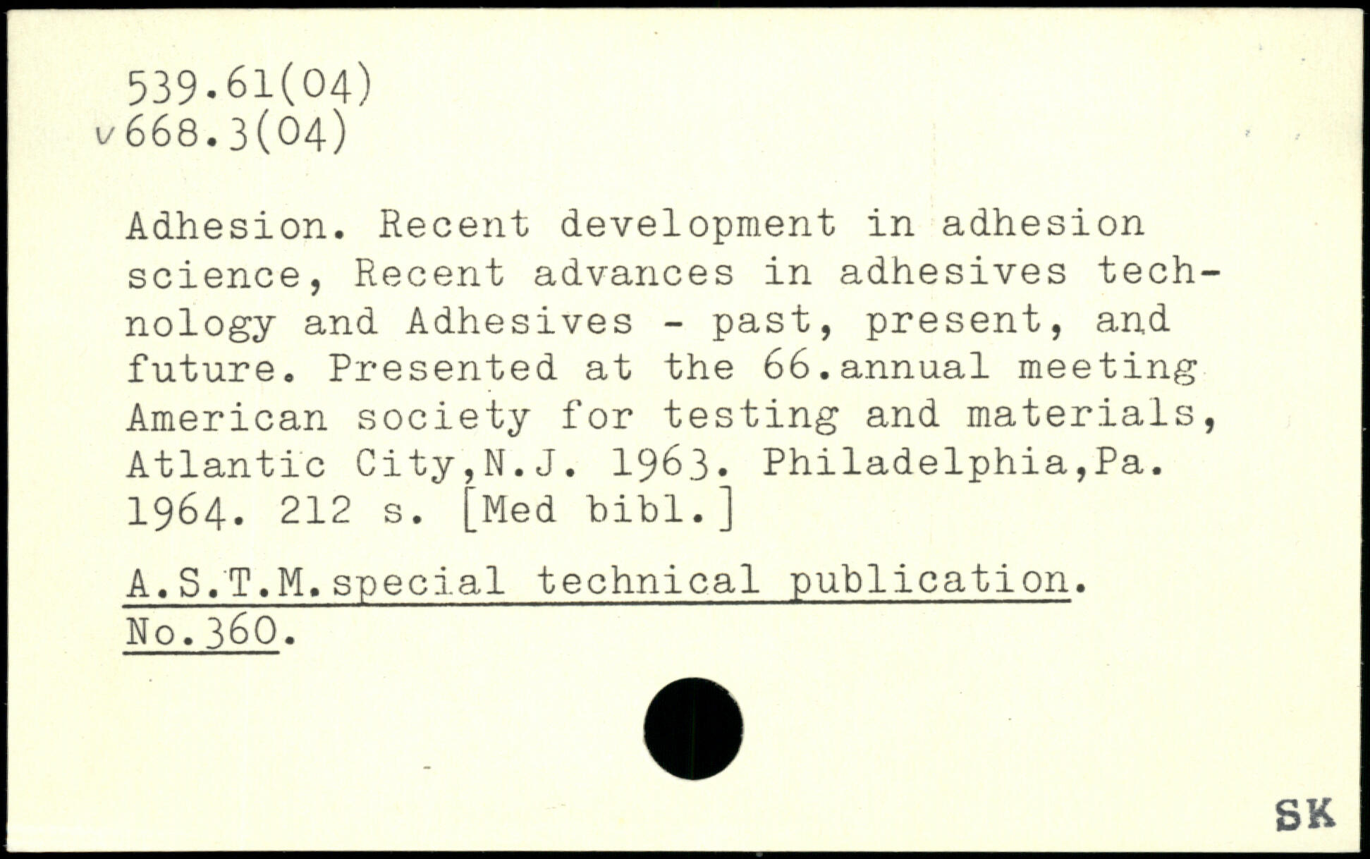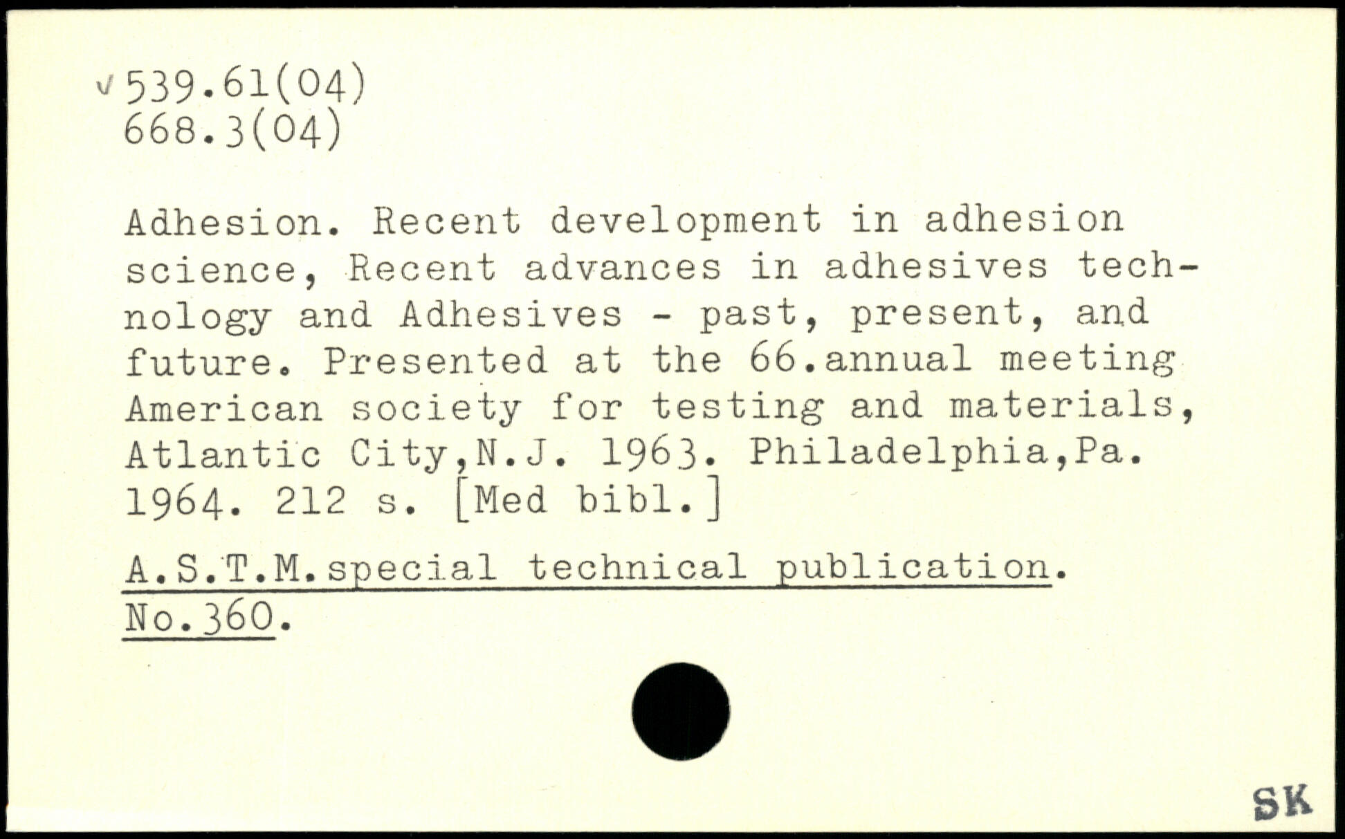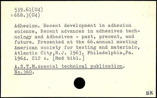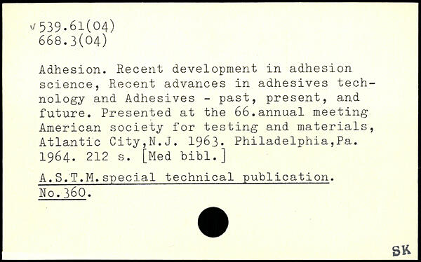 Adhesion. Recent development in adhesion science, Recent advances in adhesives technology and Adhesives - past, present, and future. Presented at the 66.annual meeting American society for testing and materials, Atlantic City,N.J. 1963. Philadelphia,Pa. 1964.