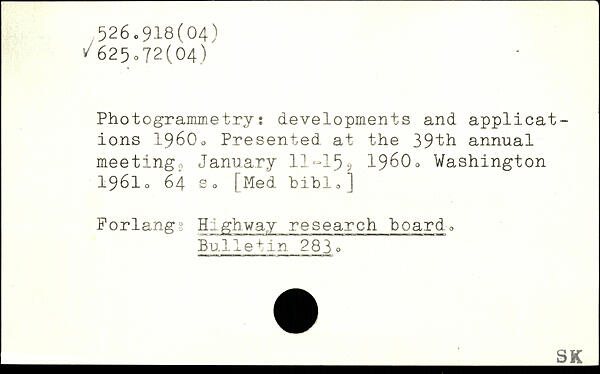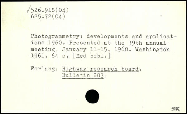 Photogrammetry: developments and applications 1960o Presented at the 391h annual meeting^ January 11-159 19600