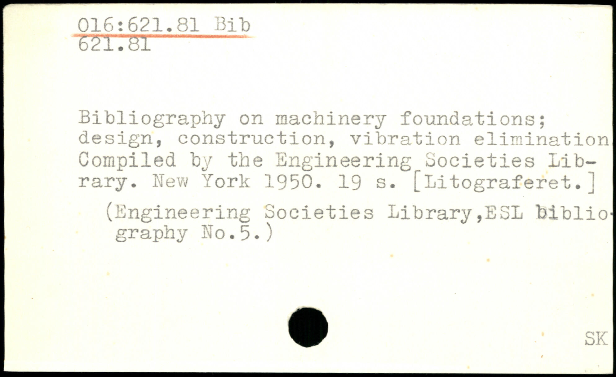 TZT7BI-- Bibliography on machinery foundations; design, construction, vibration elimination Compiled by the Engineering Societies Library.