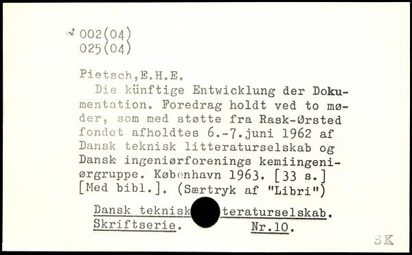 Die künftige Entwicklung der Dokumentation. Foredrag holdt ved to møder, som med støtte fra Rask-Ørsted fondet afholdtes 6.-7.juni 1962 af Dansk teknisk litteraturselskab og Dansk ingeniørforenings kemiingeniørgruppe.