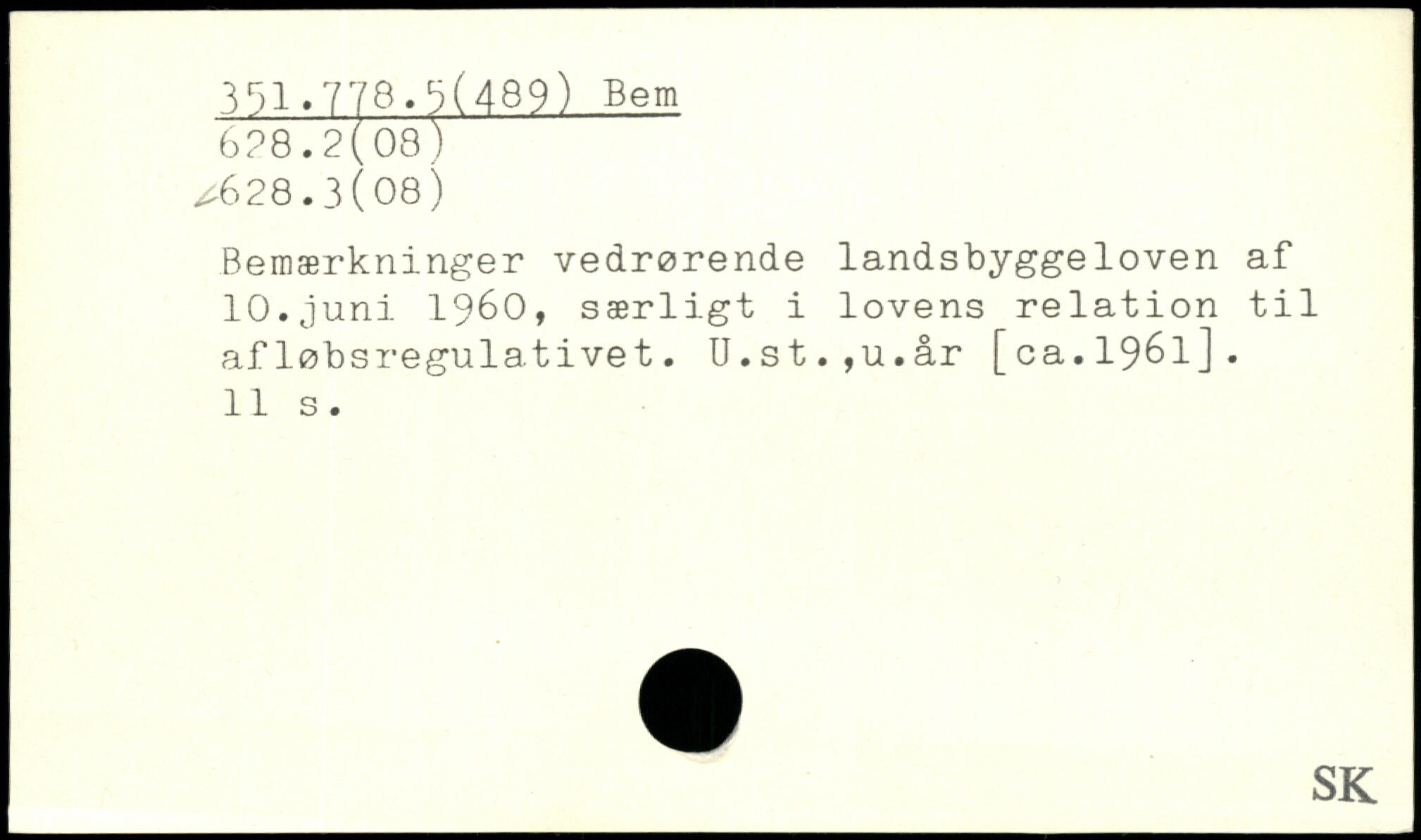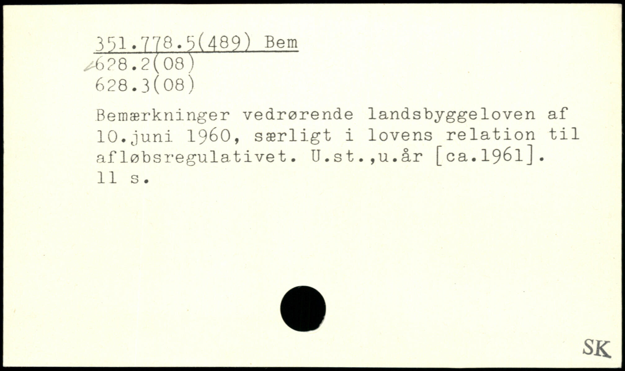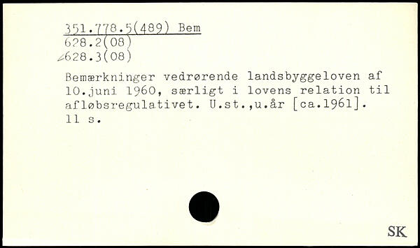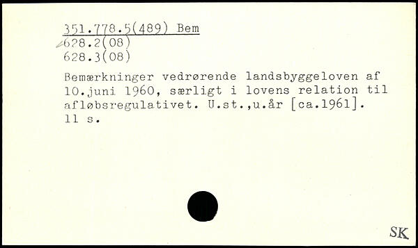 Bemærkninger vedrørende landsbyggeloven af 10.juni 1960, særligt i lovens relation til afløbsregulativet. U.st.,u.år [ca.1961].