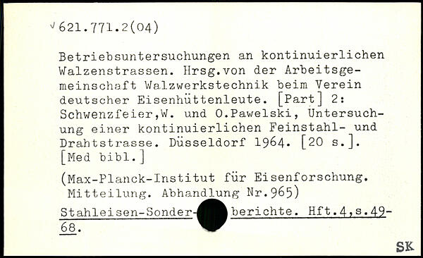 Betriebsuntersuchungen an kontinuierlichen Walzenstrassen. Hrsg.von der Arbeitsgemeinschaft Walzwerkstechnik beim Verein deutscher Eisenhuttenleute. [Part] 2: Schwenzfeier,W. und 0.Pawelski, Untersuchung einer kontinuierlichen Feinstahl- und j Draht strasse. Düsseldorf 1964. [