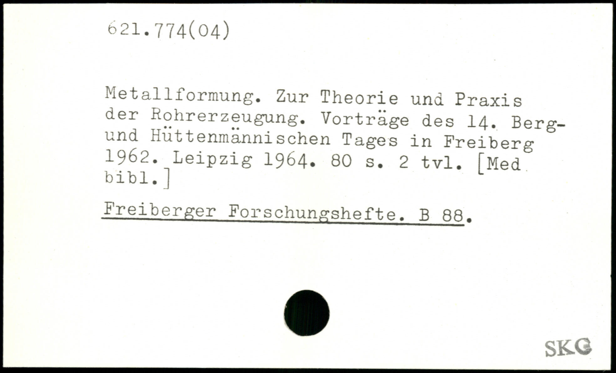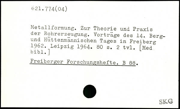 Metallformung. Zur Theorie und Praxis der Rohrerzeugung. Vorträge des 14. Berg-und Hüttenmännischen Tages in Freiberg 1962.