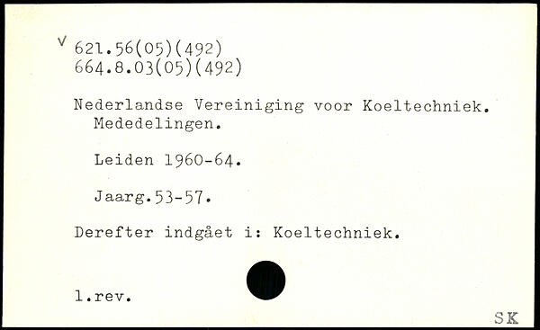 Nederlandse Vereiniging voor Koeltechniek. Mededelingen. Leiden 1960-64. Jaarg.53-57. Derefter indgået i: Koeltechniek.