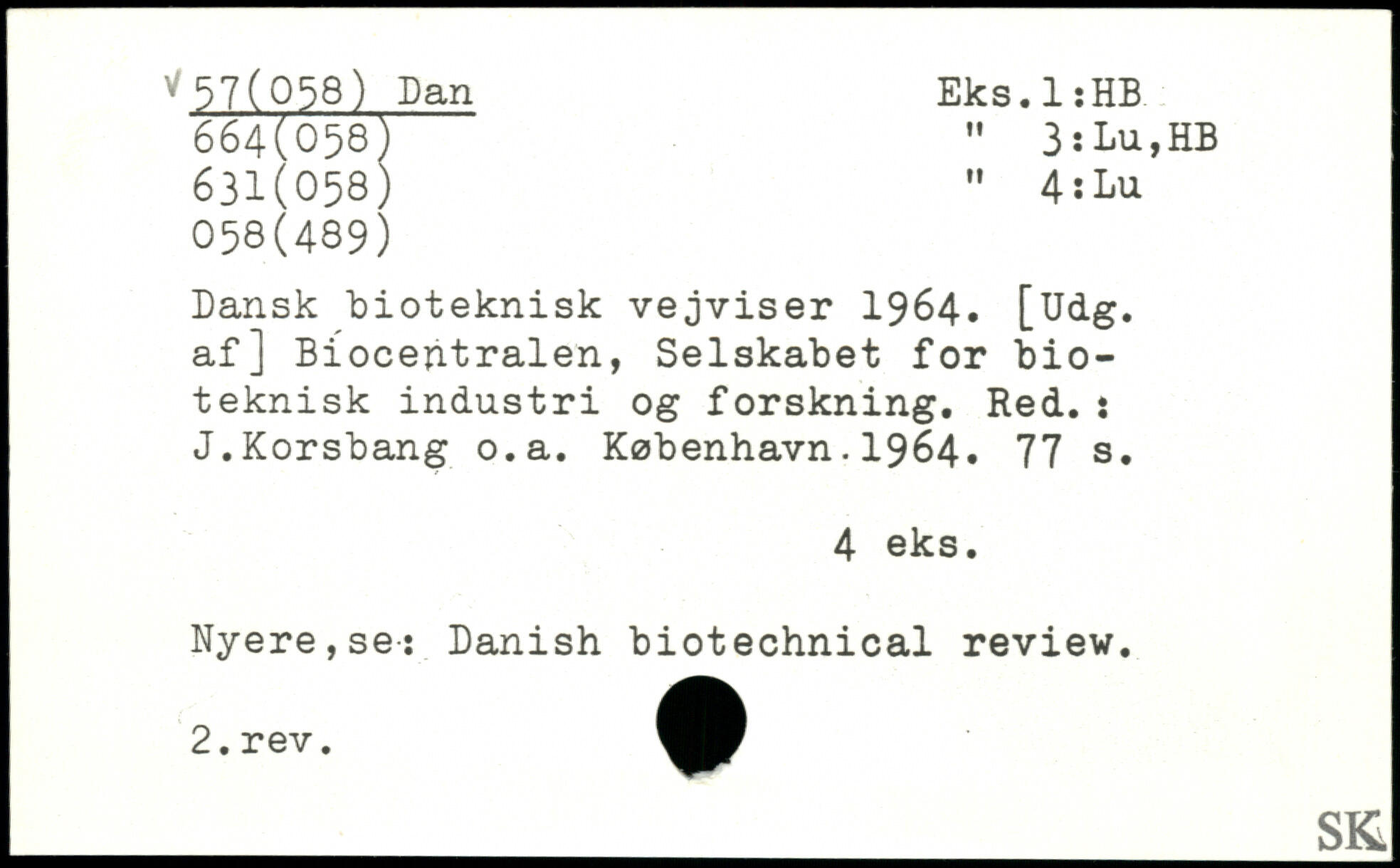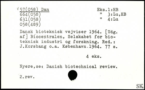 Dansk Bioteknisk vejviser 1964, [Udg. af] Biocentralen, Selskabet for bioteknisk industri og forskning. Red.: J.Korsbang o.a. København.1964.