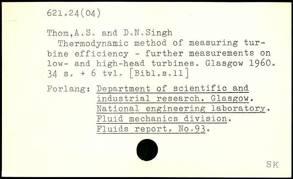 Thom,A,S9 and DJ,Singh Thermodynamic method of measuring turbine efficiency - further measurements on low- and high-head turbines. Glasgow 1960