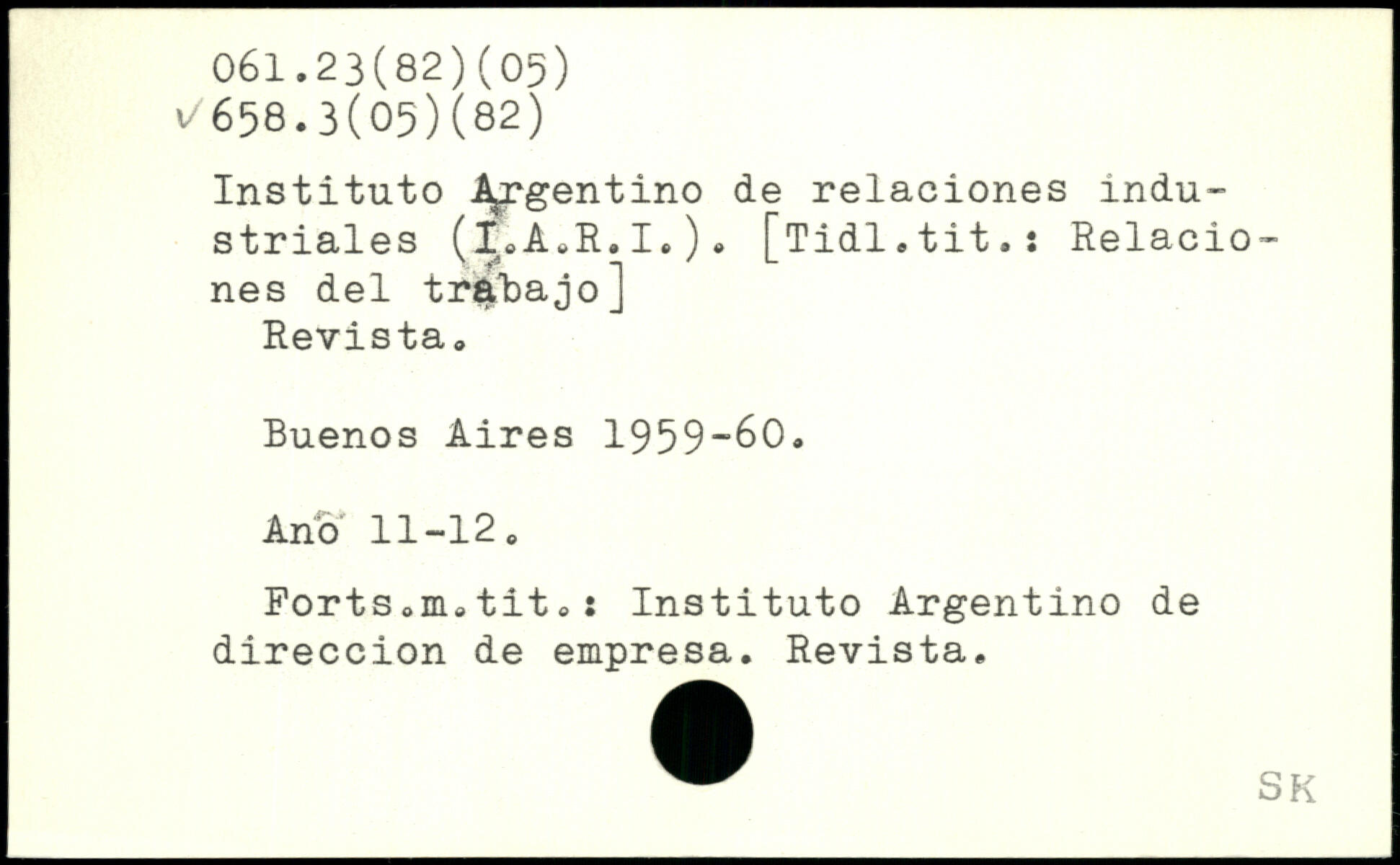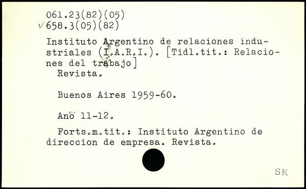 Instituto AjTgentino de relaciones industriales (I,A.R.I.), [Tidl.tit.: Relaciones del traBajo] Revista, Buenos Aires 1959-60. Ano 11-12, Ports ,ni, tit , : Instituto Argentino de direccion de empresa. Revista.