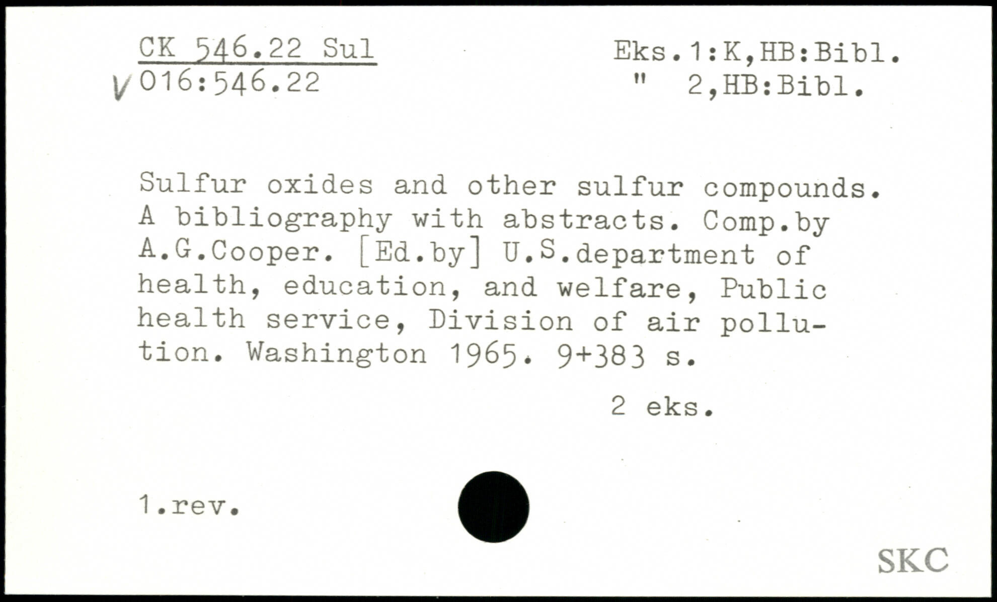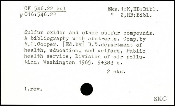 Sulfur oxides and other sulfur compounds. A bibliography with abstracts. Comp.by A.G.Cooper. [Ed.by] U.S.department of health, education, and welfare, Public health service, Division of air pollution. Washington 19 65.