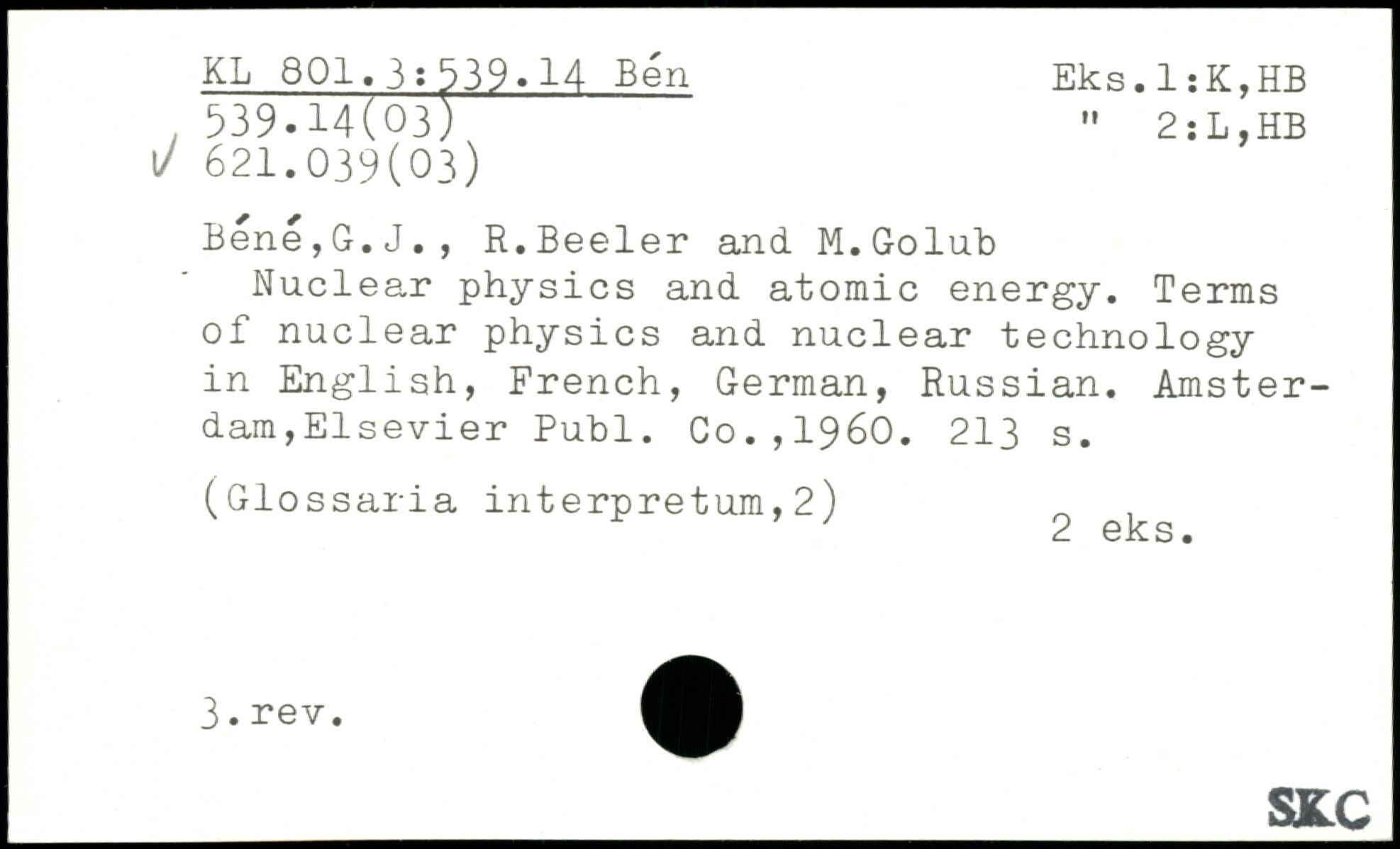 Nuclear physics and atomic energy. Terms of nuclear physics and nuclear technology in English, French, German, Russian. Amsterdam,Elsevier Publ. Co.,1960.