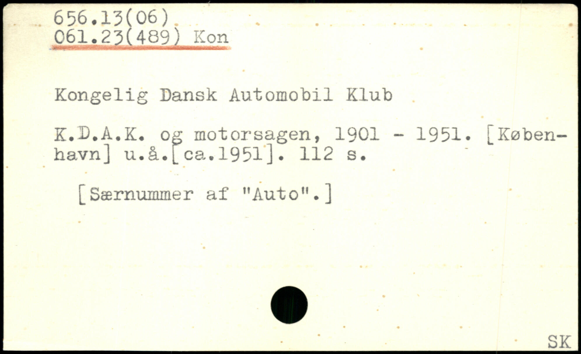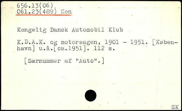 Kongelig Dansk Automobil Klub K.D.A.K. og motorsagen, 1901 - 1951, [København] u.å.[ca.1951].