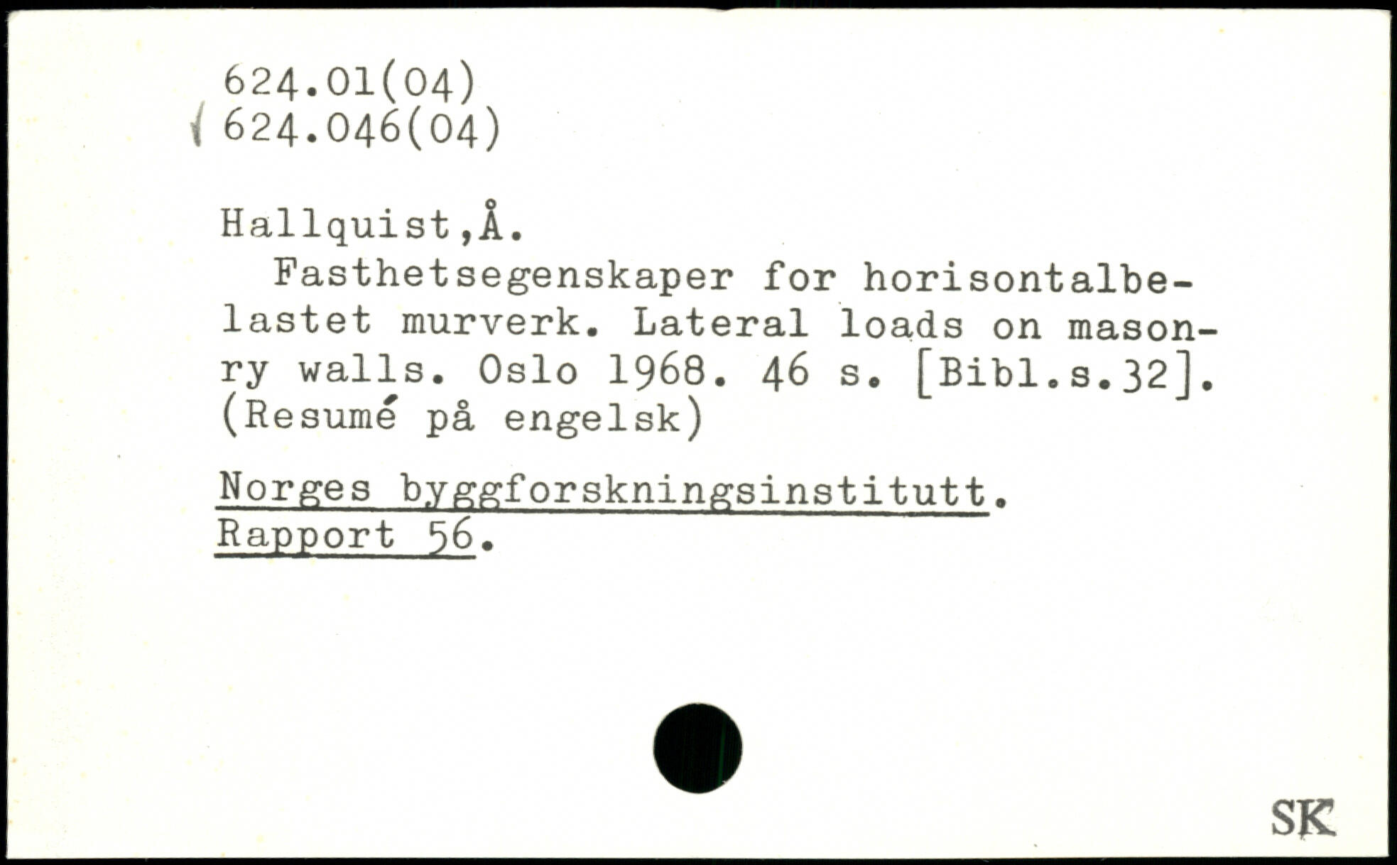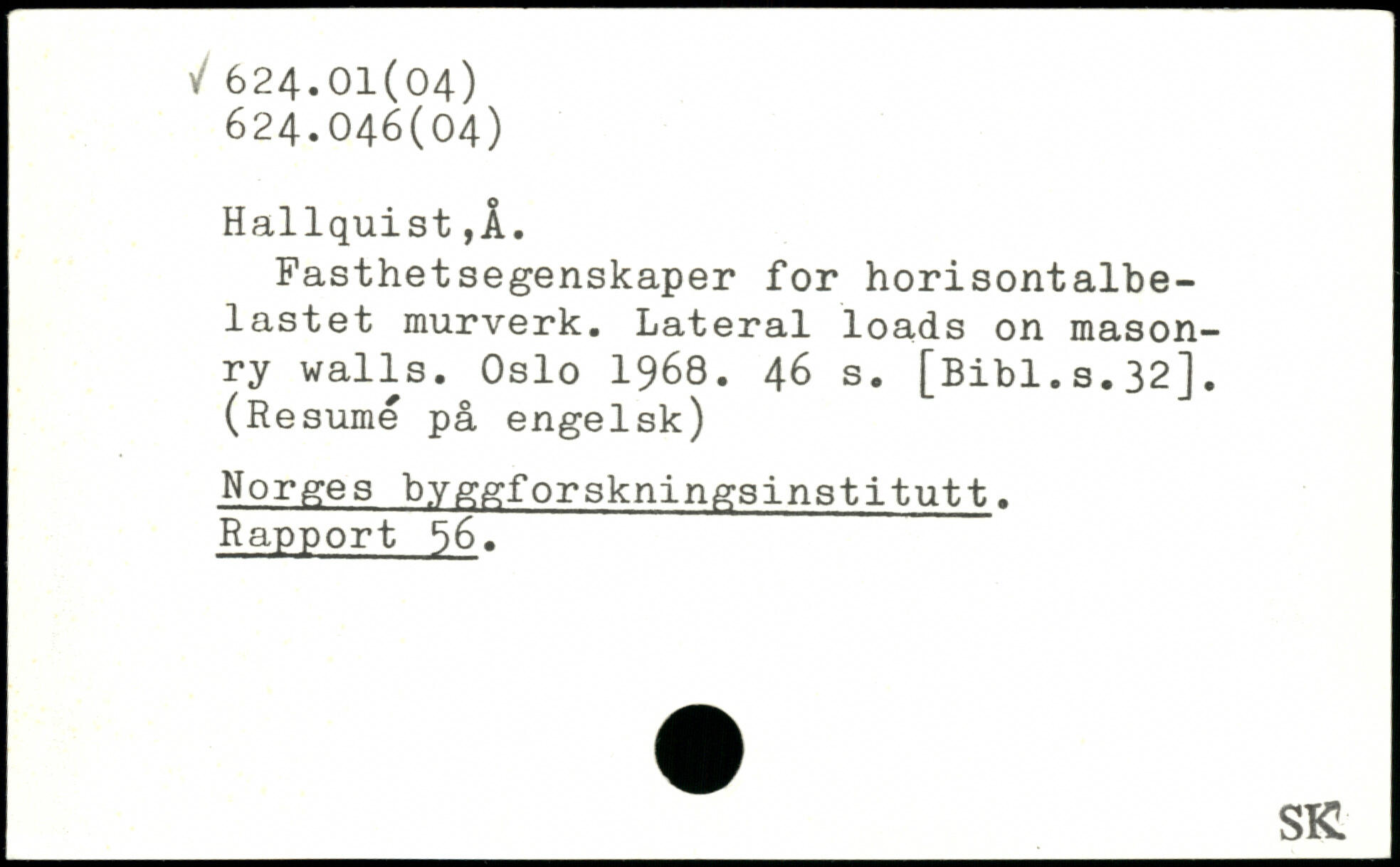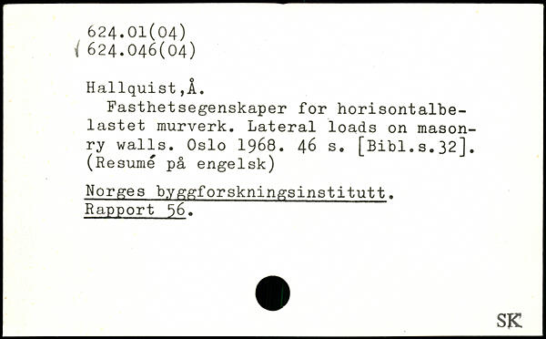 Fasthetsegenskaper for horisontalbe-lastet murverk. Lateral loads on masonry walls. Oslo 1968.