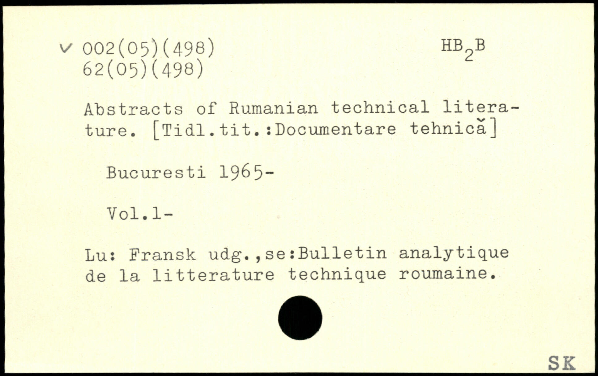 Abstracts of Rumanian technical literature. [Tidl.tit.:Documentare tehnicâ]