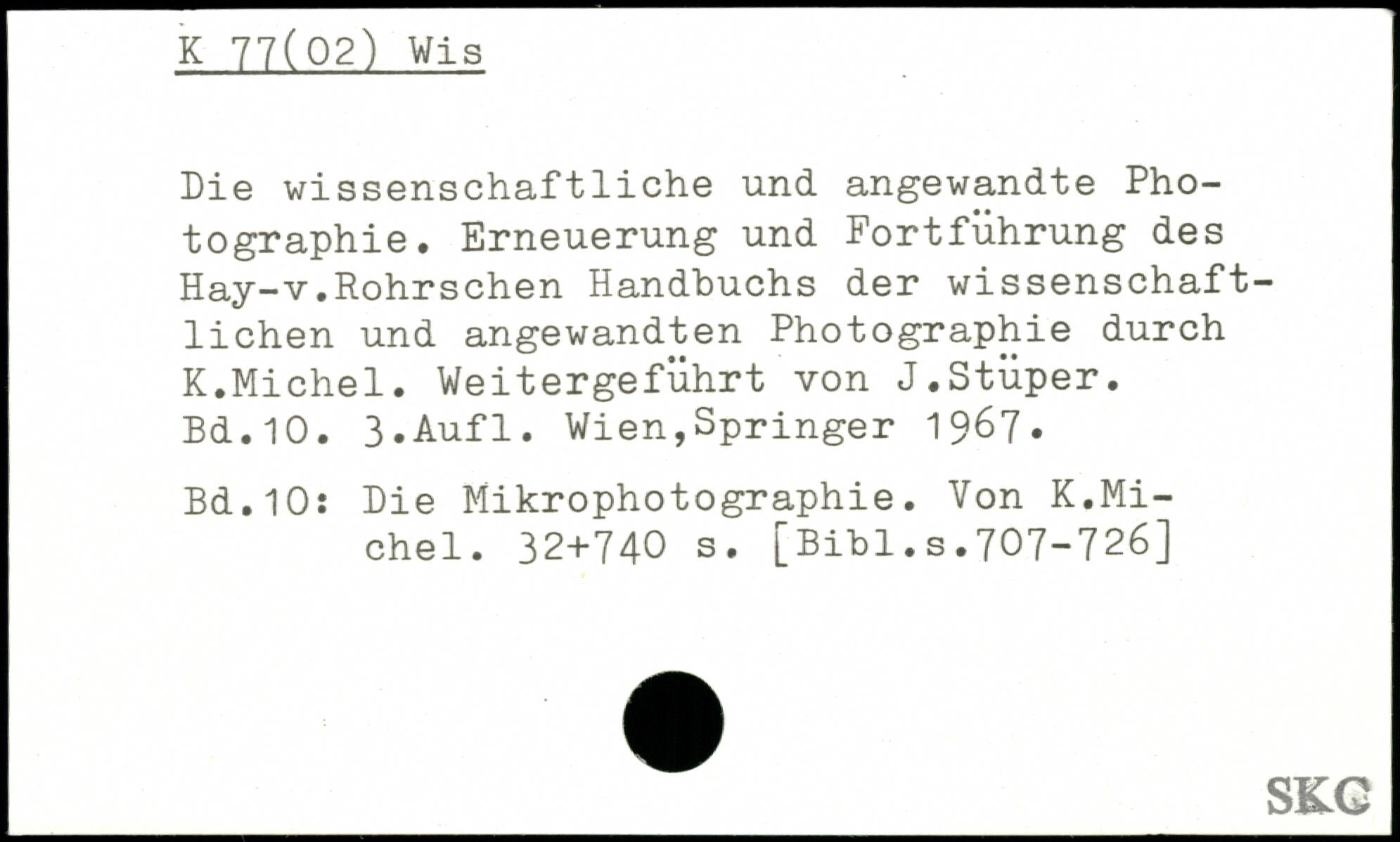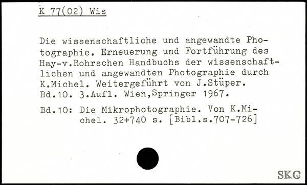 Die wissenschaftliche und angewandte Photographie. Erneuerung und Fortführung des Hay-v.Rohrsehen Handbuchs der wissenschaftlichen und angewandten Photographie durch K.Michel. Weitergeführt von J.Stüper.