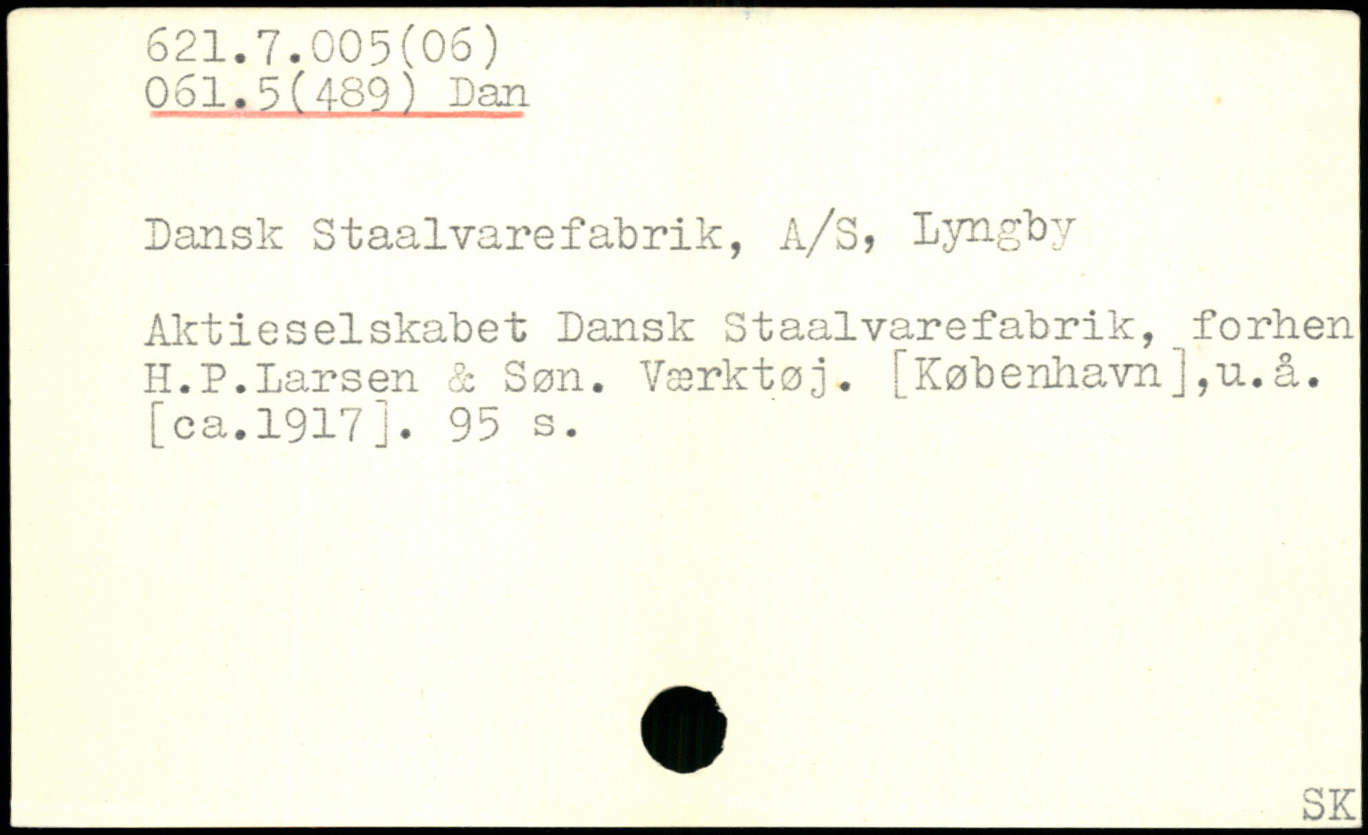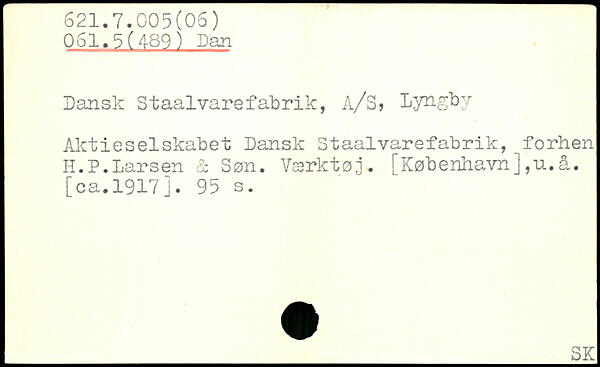 Dansk Staalvarefabrik, A/S, Lyngby Aktieselskabet Dansk Staalvarefabrik, forhen H.P.Larsen & Søn. Værktøj. [København],u.å. [oa.1917].