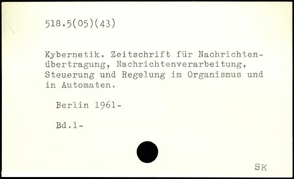 Kybernetik, Zeitschrift für Nachrichtenübertragung, Nachrichtenverarbeitung, Steuerung und Regelung im Organismus und in Automaten.