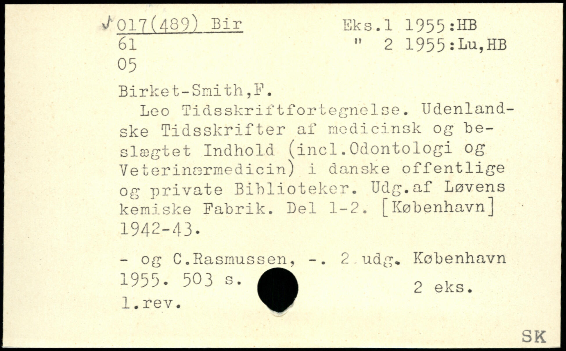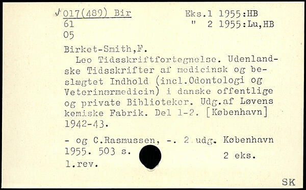 Leo Tidsskriftfortegnelse. Udenlandske Tidsskrifter af medicinsk og beslægtet Indhold (incl.Odontologi og Veterinærmedicin) i danske offentlige og private Biblioteker. Udg.af Løvens kemiske Fabrik. Bel 1-2.