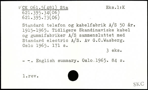 Standard telefon og kabelfabrik å/S 50 år. 1915-1965, Tidligere Skandinaviske kabel og gummifabriker A/S sammensluttet med Standard electric A/S. Av G.C.Wasberg. Oslo 1965.