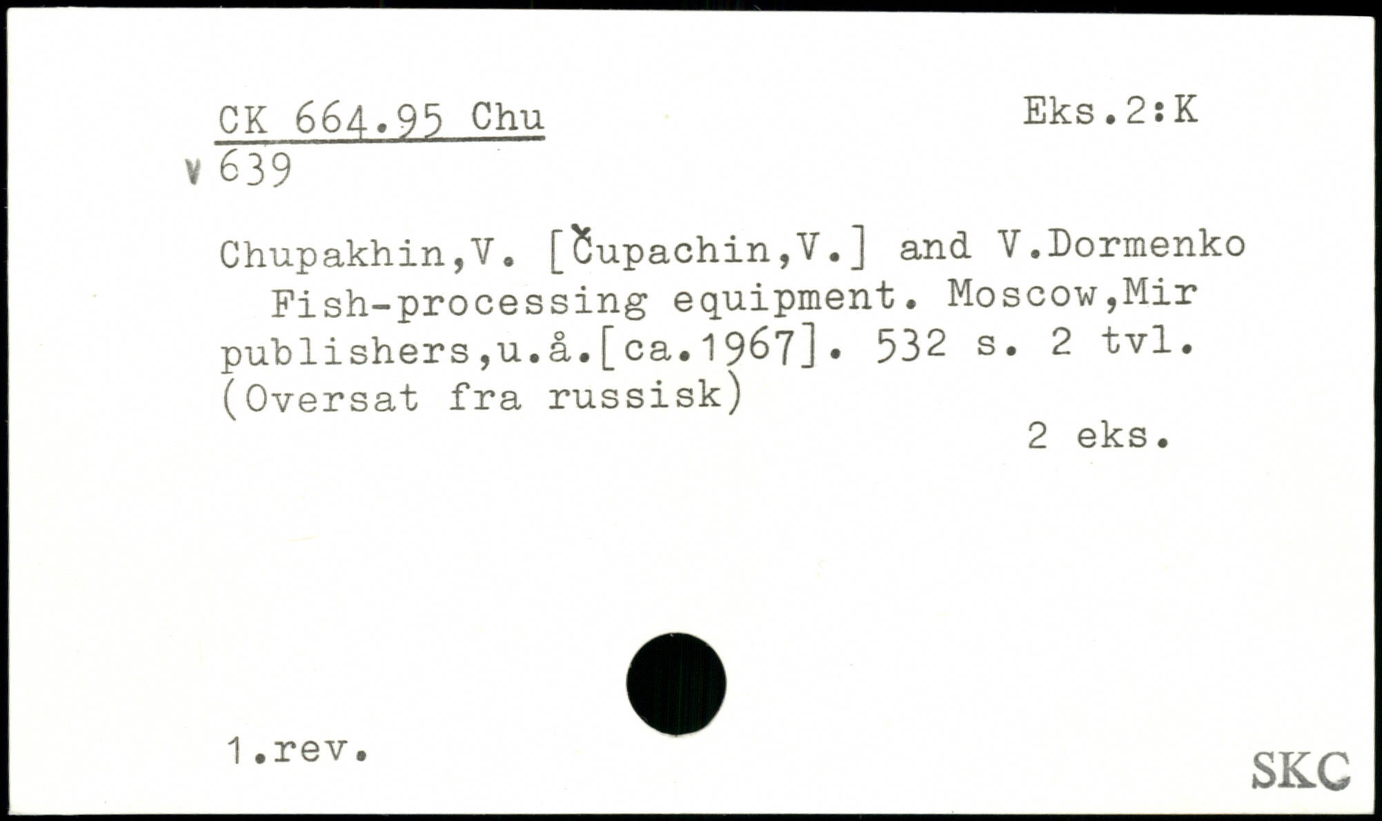 Chupakhin,V. [Supachin,V.] and V.Dormenko Fish-processing equipment. Moscow,Mir publishers,u.a.[ca.1967].